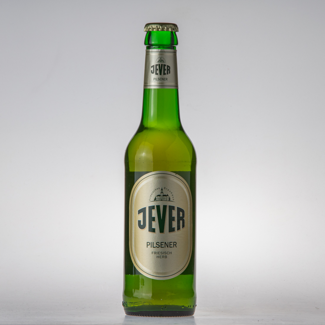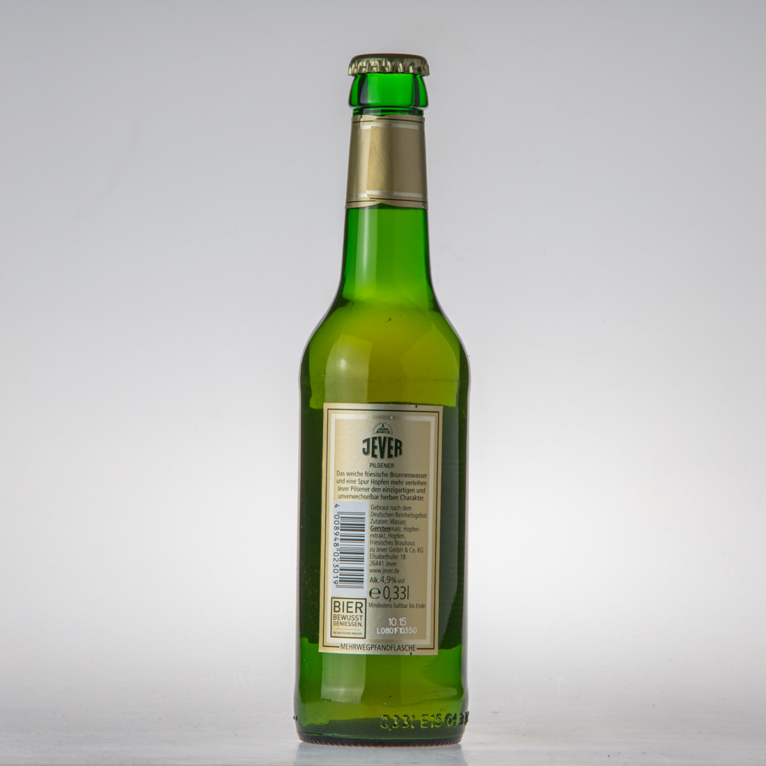 Friesisches Brauhaus / JEVER / PILSENER / Das weiche friesisches Brunnenwasser und eien Spur Hopfen mehr verleihen Jever Pilsener den einzigartigen und unverwechselbar herben Charakter. / Gebraut nach dem Deutschen Reinheitsgebot. / Zutaten: Wasser, Gerstenmalz, Hopfenextrakt, Hopfen. / Friesisches Brauhaus zu Jever GmbH & Co. KG Elisabethufer 18 26441 Jever www.jever.de / Alk. 4,9% vol / e 0,33l / Mindestens haltbar bis Ende: / 4 008948 023019 / BIER BEWUSST GENIESSEN DIE DEUTSCHEN BRAUER / MEHRWEGPFANDFLASCHE