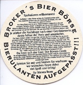 BROKER’S BIER BÖRSE / BIERULANTEN AUFGEPASST!!! / Spekulieren willkommen! / In Broker’s Bier Börse stehen die Getränkepreise nicht fest, sondern werden von der Nachfrage bestimmt, .h. von Ihnen und anderen Gästen. / Ihre Bestellung wird in unser Kassensystem eingegeben, das mit unserem Börsenrechner verbunden ist. Dieser errechnet im Zwei-Minuten-Rhythmus den jeweils aktuellen Kurs für die verschiedenen Getränke und überträgt sie auf die Monitore, die gut einsehbar im Gastraum plaziert sind. / Je stärker die Nachfrage nach einer Getränkesorte, desto höher der Getränkepreis und umgekehrt. / Die Kurse können dabei z.B. von DM 2,40 für das 0,30 L-Glas Bier bis zu einem astronomischen, nach oben vollkommen offenen Preis reichen. Sie bezahlen den Preis, der zum Zeitpunkt Ihrer Bestellung auf den Monitoren angezeigt wird. Mit Ihrer Bestellung (Ihrer “Order”) erhalten Sie eine ausgedruckte Bestätigung (Coupon), auf der der aktuelle Preis und die Nummer der Zeitzone vermerkt ist, in der Sie Ihr Getränk bestellt haben - diesen Preis zahlen Sie auch dann, wenn zum Zeitpunkt der Servierung z.B. Ihres Bieres der Preis für diese Sorte längst wieder kräftig angezogen hat - wofür nicht zuletzt Ihre Bestellung verantwortlich war. / Da freut sich der Gast: Der Börsen-Crash / In unregelmäßigen Abständen passieren Börsen-Crashs und die Getränkepreise sacken für einige Minuten (fast) ins Bodenlose. Hier profitiert derjenige, der den Börsenkurs aufmerksam verfolgt hat und eine schnelle Bestellung (“Order”) unterbringen kann. / Spiele Sie mit und bleiben Sie wachsam - wir wünschen Ihnen dabei viel Spaß und Erfolg! Ihr Börsen-Team