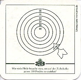 16 18 23 24 39 40 / Friesisches Brauhaus / JEVER / Wie viele Pfeile braucht man, um auf der Zielscheibe genau 100 Punkte zu erzielen? / Lösung unter www.jever.de