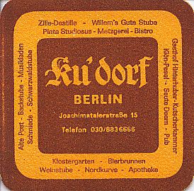 Zille-Destille / Willern’s Gute Stube / Pinta Studiosus / Metzgerei / Bistro Gasthof Hinterhuber-Kutscherkammer / Klön-Pesel / Seute Deern / Pub / Alte Post / Backstube / Musikladen / Schmiede / Schwarzwaldstube / Klostergarten / Bierbrunnen / Weinstube / Nordkurve / Apotheke / Ku’dorf / BERLIN / Joachimstalerstraße 15 / Telefon 030/8836666