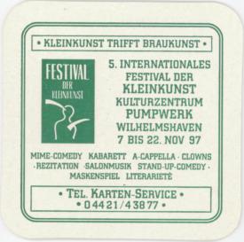 KLEINKUNST TRIFFT BRAUKUNST / FESTIVAL DER KLEINKUNST / 5. INTERNATIONALES FESTIVAL DER KLEINKUNST / KULTURZENTRUM PUMPWERK / WILHELMSHAVEN / 7. BIS 22. NOV 97 / MIME-COMEDY KABARETT A-CAPPELLA CLOWNS REZITATION SALONMUSIK STAND-UP-COMEDY MASKENSPIEL LITERARIETÈ / TEL. KARTEN SERVICE / 04421/43977