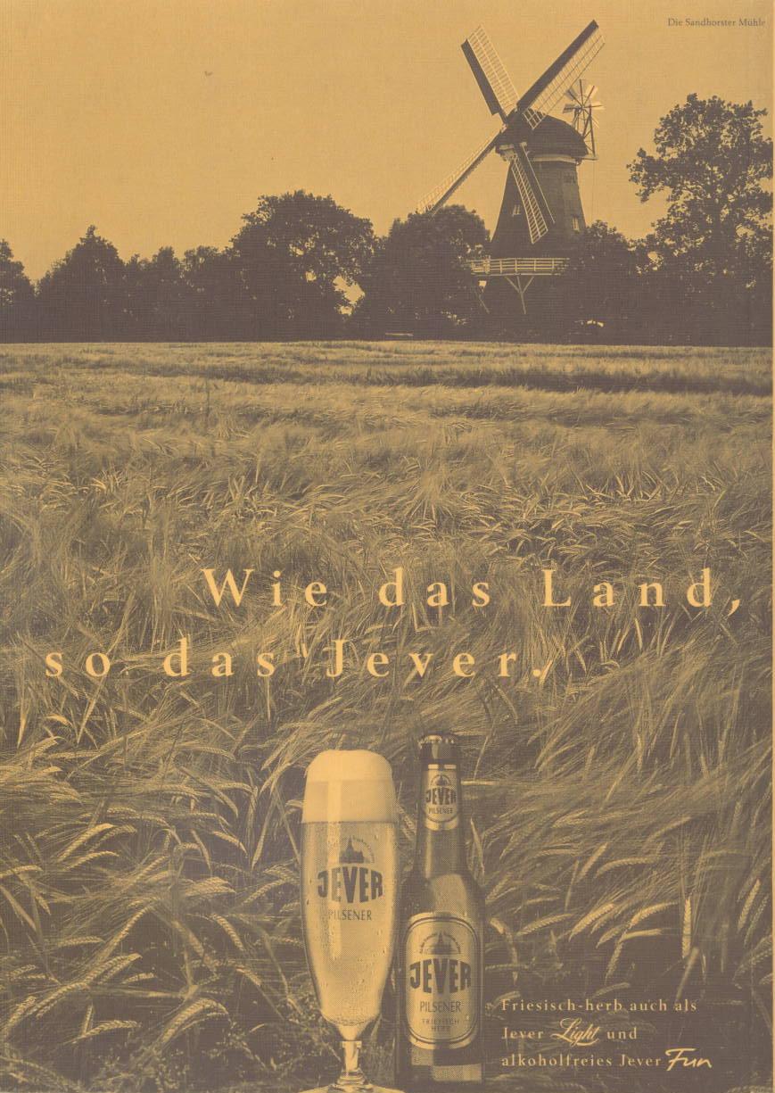 Die Sandhorster Mühle / Wie das Land, so das Jever. / Aus dem Friesischen Bruahaus zu Jever / JEVER / PILSENER / Aus dem Friesischen Brauhaus zu Jever / JEVER / PILSENER / Aus dem Friesischen Brauhaus zu Jever / JEVER / PILSENER / FRIESISCH HERB / alc 4,9% vol e 0,33l / Mindestens haltbar bis Ende … PFANDFLASCHE / Friesisch-herb auch als Jever Light und alkoholfreies Jever Fun