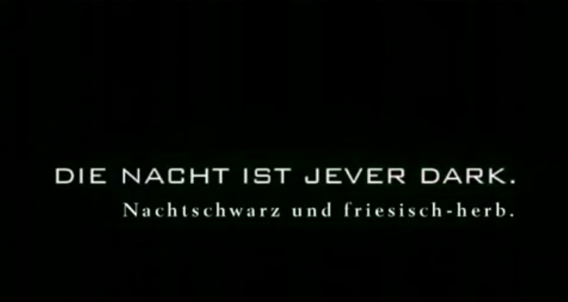Die Nacht ist mutig. / Die Nacht ist cool. / Die Nacht ist laut. / Die Nacht ist schrill. / Die Nacht ist unglaublich. / Die Nacht ist heiss. / Die Nacht ist sexy. / Die Nacht ist wild. / Die Nacht ist eröffnet. / Die Nacht ist unvergesslich. / Die Nacht ist Jever Dark. / Nachtschwarz und friesisch-herb.