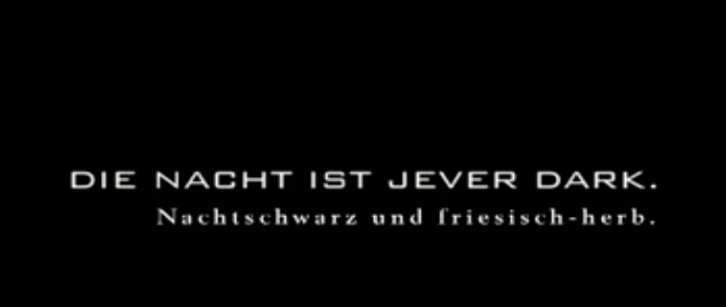 Die Nacht ist mutig. / Die Nacht ist cool. / Die Nacht ist laut. / Die Nacht ist schrill. / Die Nacht ist unglaublich. / Die Nacht ist heiss. / Die Nacht ist sexy. / Die Nacht ist wild. / Die Nacht ist eröffnet. / Die Nacht ist unvergesslich. / Die Nacht ist da. / Die Nacht ist Jever Dark. / Nachtschwarz und friesisch-herb.