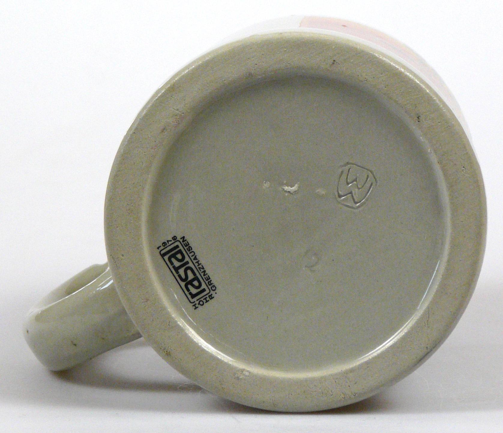Attribut Wert Alter (min.) Alter (max.) Identifikation (Jever-Fan) ID I001945 / K0051 / B16 Typ Krug Attribute (Allgemein) Form Krug / Seidel Füllstrich geprägt > 0,5l//// Herstellername Rastal GmbH & Co. KG Hersteller-Zeichen WW Hersteller-Zeichen rastal Inhalt (l) 0,50 Logo Pilsener 2 Maße HxBxT (cm) 12,7x9,9x9,9 Material Steingut Ort Norderney > Norderney > Landkreis Aurich > Niedersachsen > Deutschland Sorte Pilsener Attribute (Zeitstempel) Eigene 19770000 1977 1977