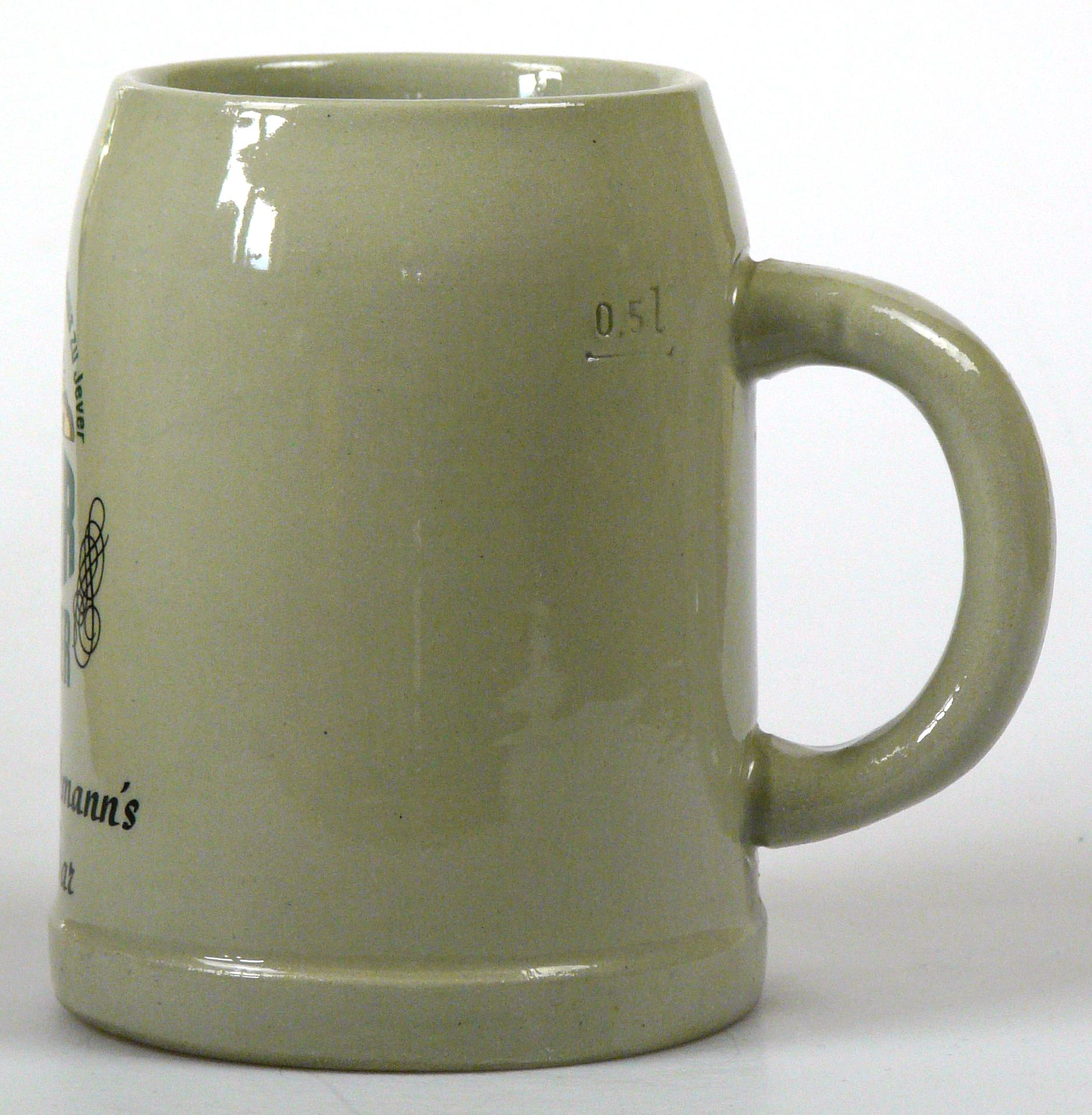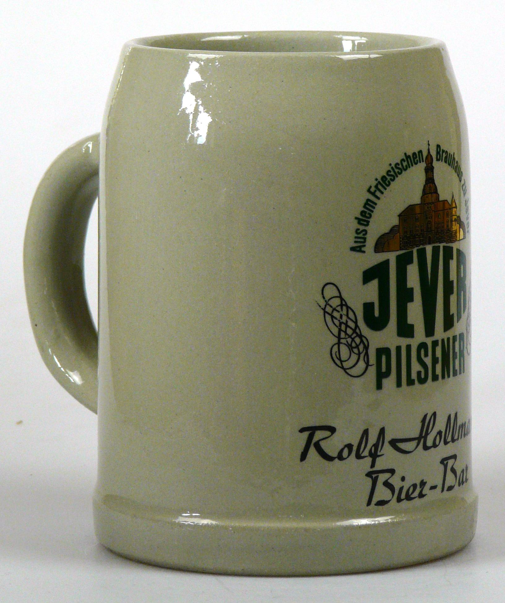 Attribut Wert Alter (min.) Alter (max.) Identifikation (Jever-Fan) ID I002013 / K0119 / B4 Typ Krug Attribute (Allgemein) Form Krug / Seidel Füllstrich geprägt > 0,5l//// Hersteller-Zeichen WW Inhalt (l) 0,50 Logo Pilsener 6 Maße HxBxT (cm) 12,8x9,9x9,9 Material Steingut Sorte Pilsener