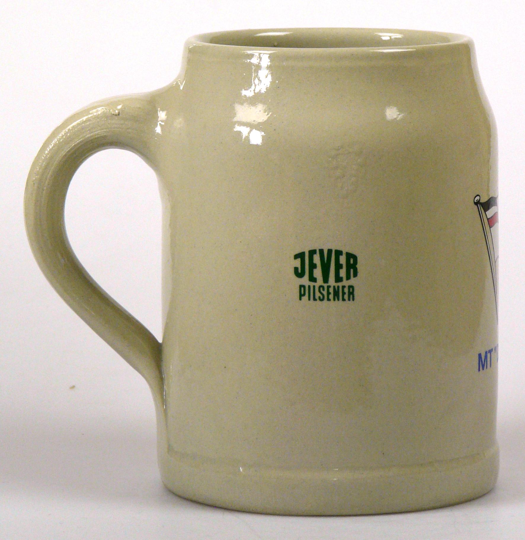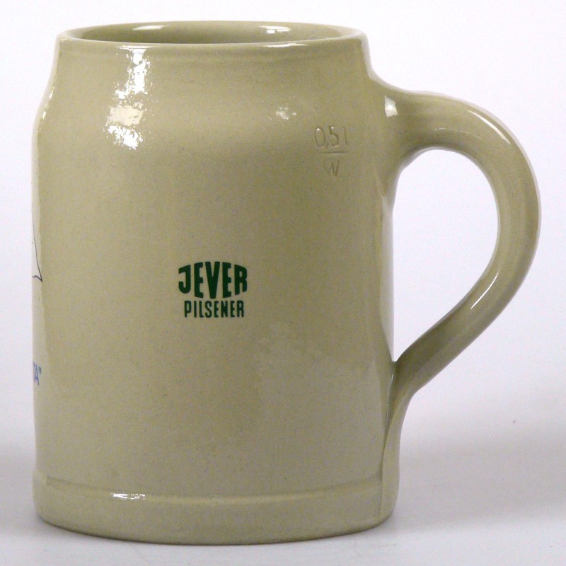Attribut Wert Alter (min.) Alter (max.) Identifikation (Jever-Fan) ID I002014 / K0120 / B4 Typ Krug Attribute (Allgemein) Form Krug / Seidel Füllstrich geprägt > 0,5l////W Hersteller-Zeichen W Inhalt (l) 0,50 Logo Pilsener 2 Maße HxBxT (cm) 13x9,9x9,9 Material Steingut Sorte Pilsener