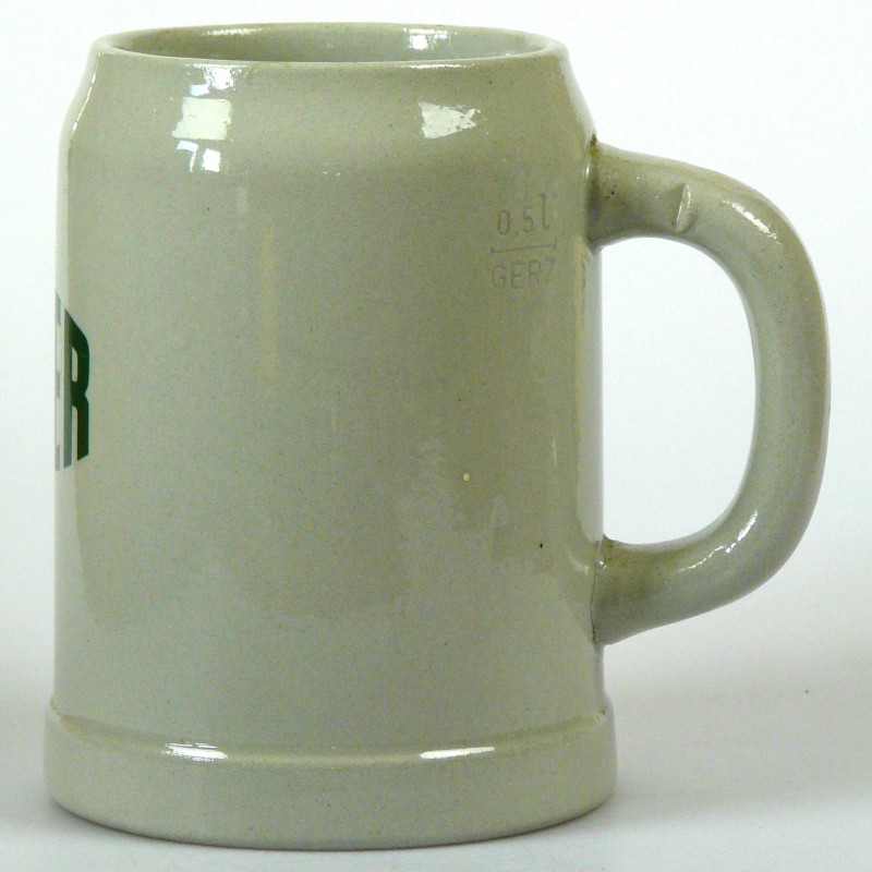 Attribut Wert Alter (min.) Alter (max.) Identifikation (Jever-Fan) ID I002051 / K0157 / B7 Typ Krug Attribute (Allgemein) Form Krug / Seidel Füllstrich geprägt > 0,5l////GERZ Hersteller-Zeichen GERZ Inhalt (l) 0,50 Logo Dachmarke 1 Maße HxBxT (cm) 13,3x10,2x10,2 Material Steingut Sorte (Dachmarke)