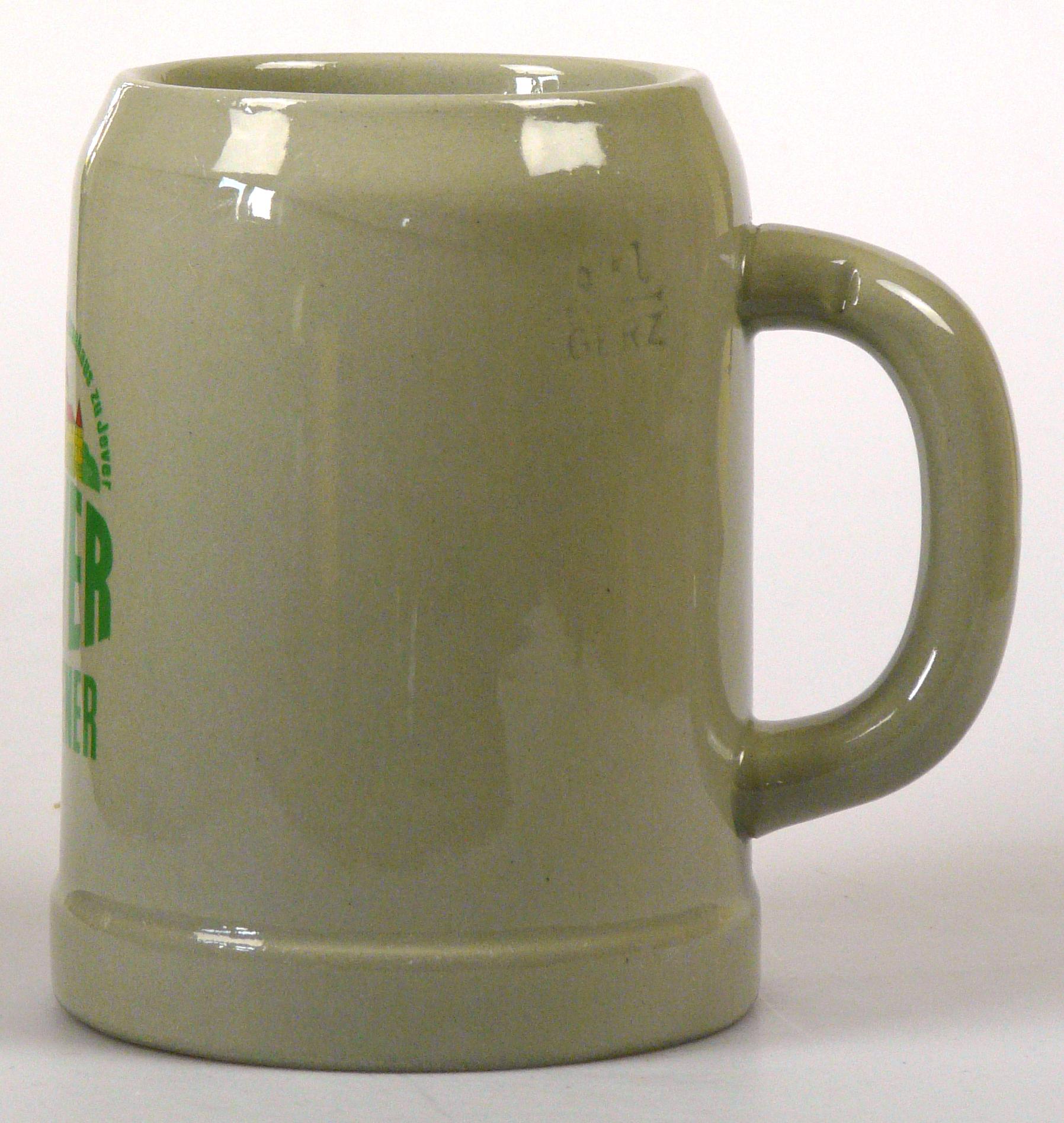 Attribut Wert Alter (min.) Alter (max.) Identifikation (Jever-Fan) ID I002057 / K0163 / B7 Typ Krug Attribute (Allgemein) Form Krug / Seidel Füllstrich geprägt > 0,5l////GERZ Hersteller-Zeichen GERZ Inhalt (l) 0,50 Logo Pilsener 21 Maße HxBxT (cm) 13,2x10x10 Material Steingut Sorte Pilsener
