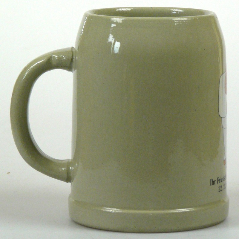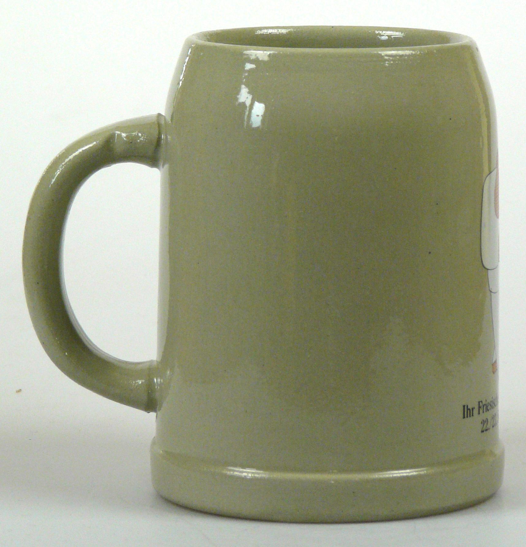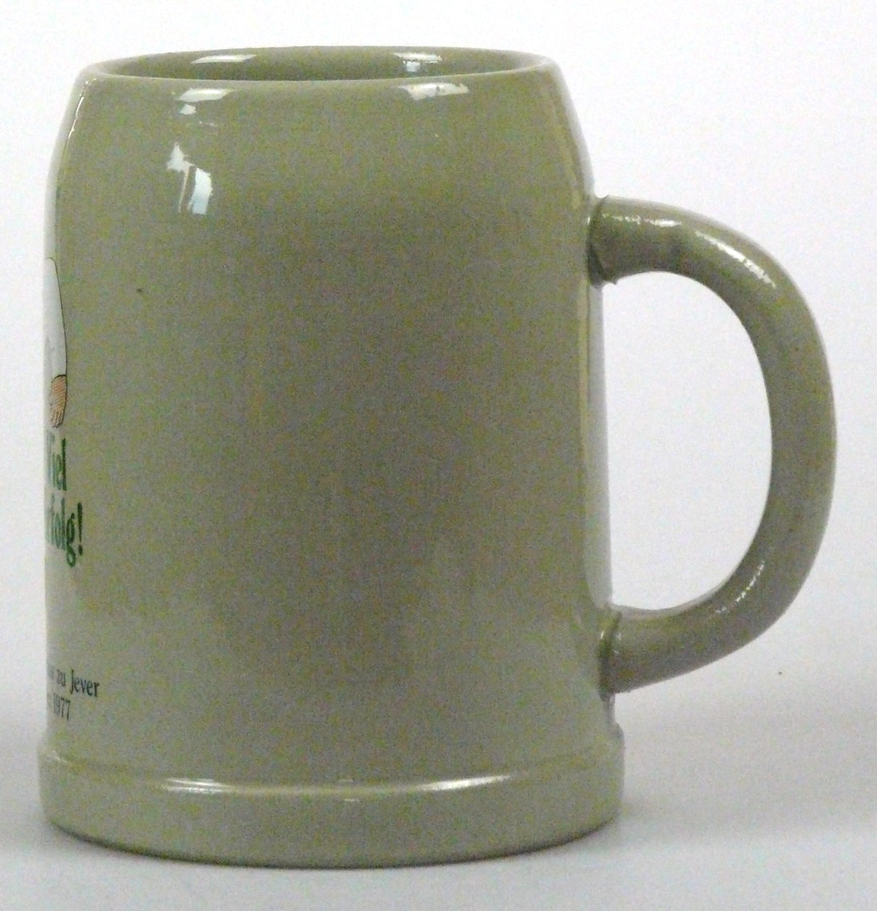 Attribut Wert Alter (min.) Alter (max.) Identifikation (Jever-Fan) ID I002078 / K0175 / B8 Typ Krug Attribute (Allgemein) Form Krug / Seidel Füllstrich geprägt > 0,5l//// Hersteller-Zeichen WW Inhalt (l) 0,50 Logo Pilsener 2 Maße HxBxT (cm) 12,7x9,9x9,9 Material Steingut Motiv Rundliche Schrift Sorte Pilsener Attribute (Zeitstempel) Eigene 19770922, 19770923 22.09.1977 23.09.1977