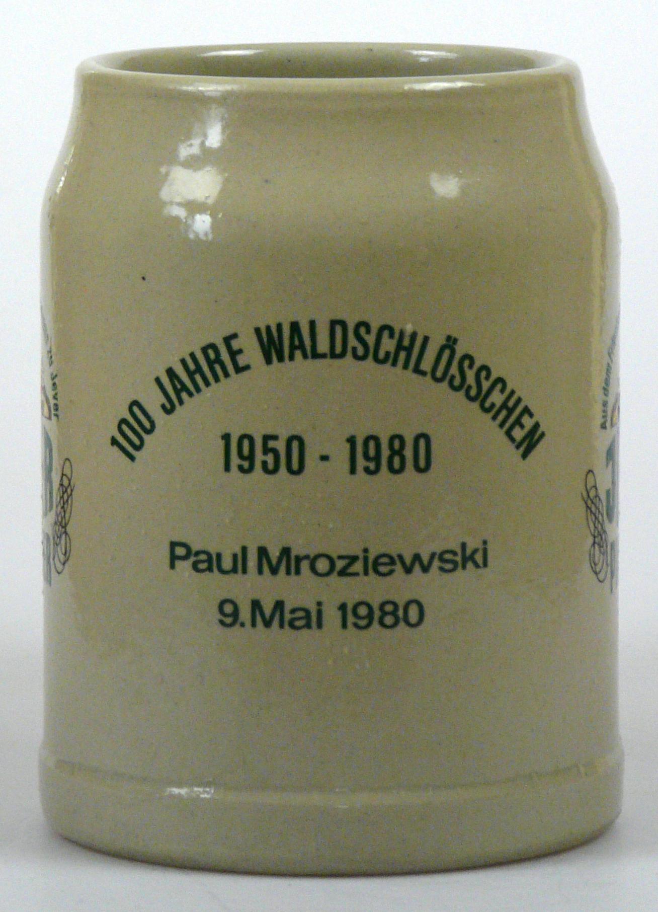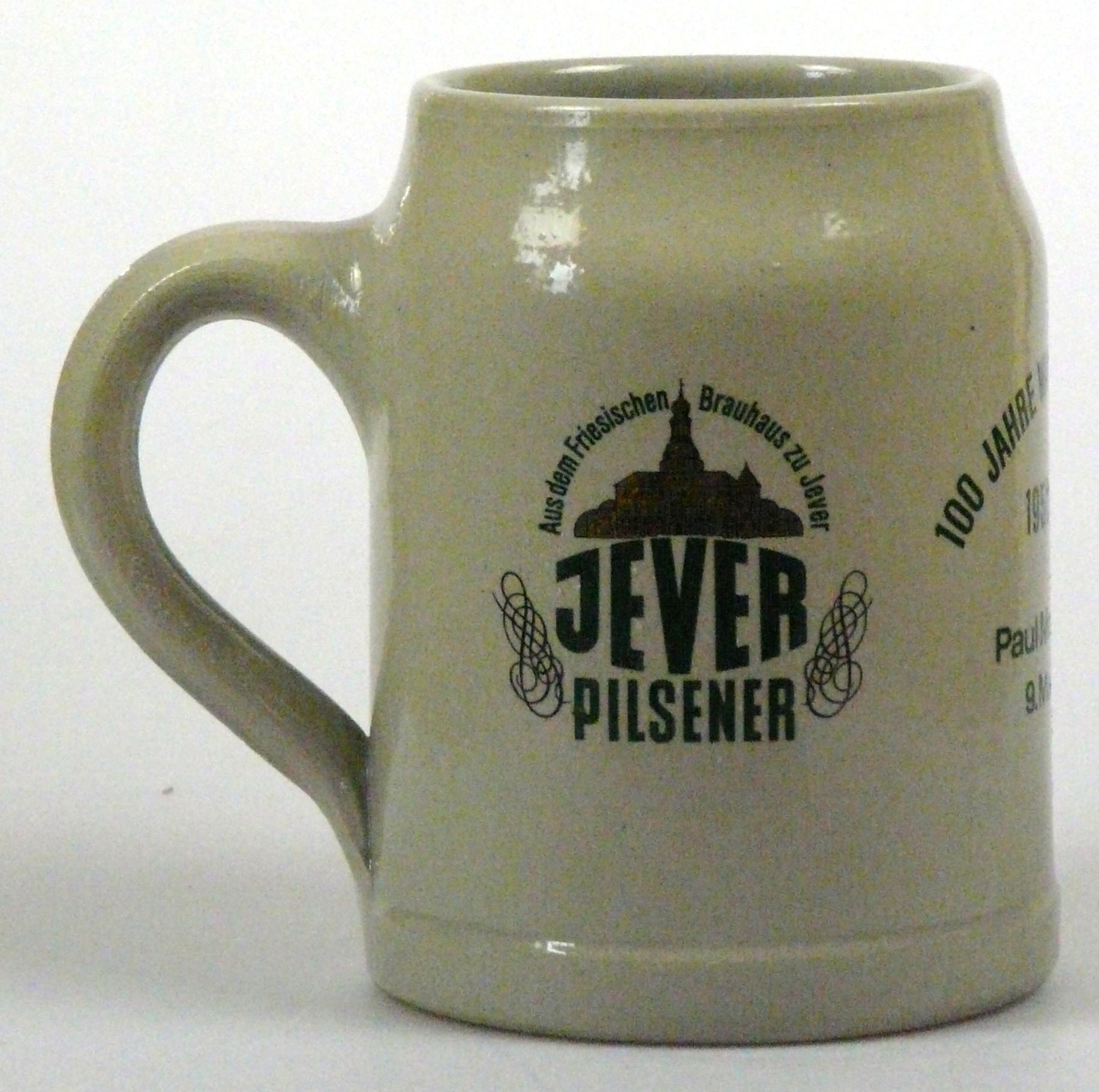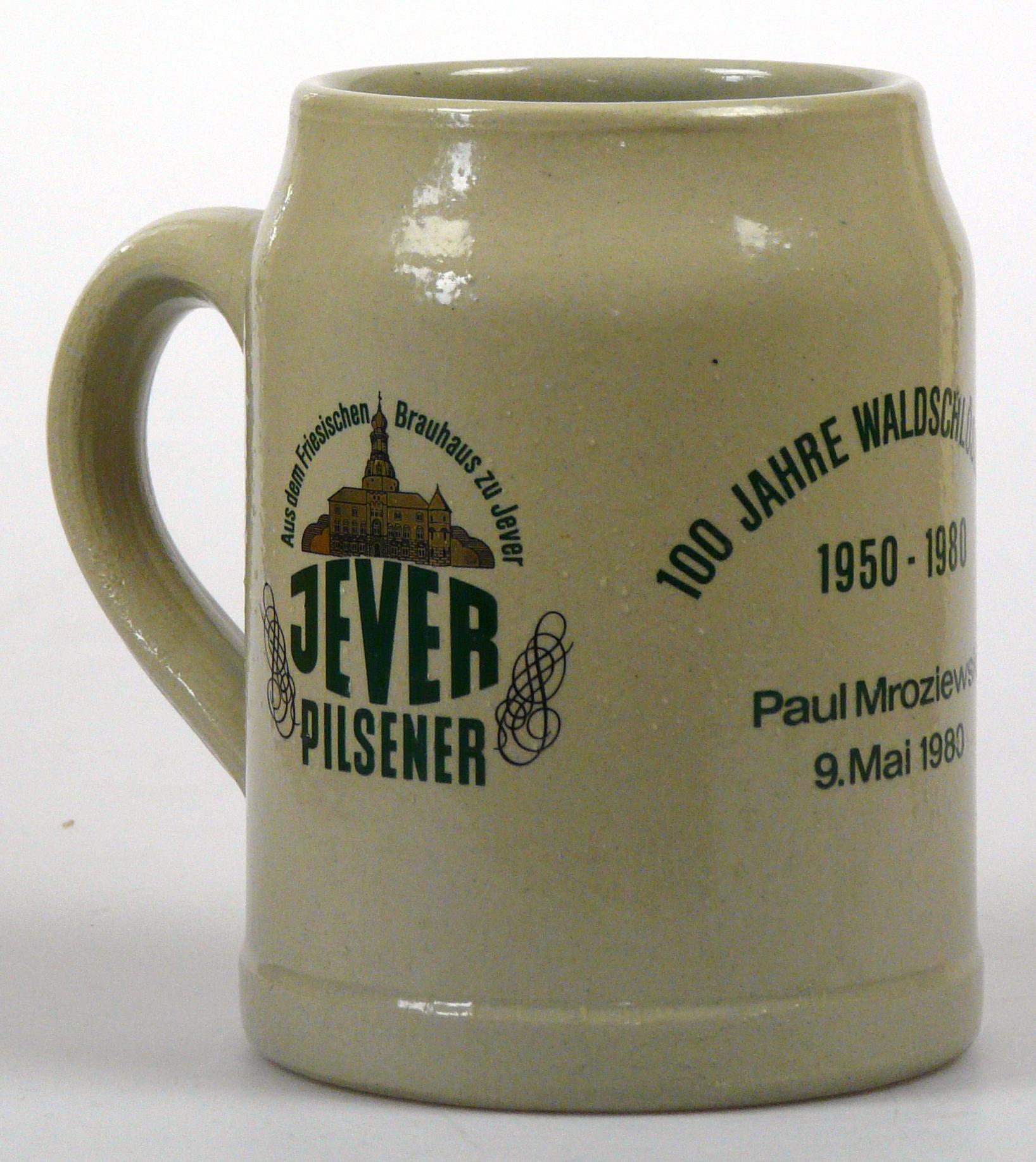 Attribut Wert Alter (min.) Alter (max.) Identifikation (Jever-Fan) ID I002083 / K0180 / B8 Typ Krug Attribute (Allgemein) Event 100 Jahre Waldschlößchen Form Krug / Seidel Füllstrich geprägt > 0,5l////W Gastronomie Waldschlößchen Hersteller-Zeichen W Inhalt (l) 0,50 Logo Pilsener 6 Maße HxBxT (cm) 12,9x9,9x9,9 Material Steingut Sorte Pilsener Attribute (Zeitstempel) Eigene 19800509 09.05.1980 09.05.1980