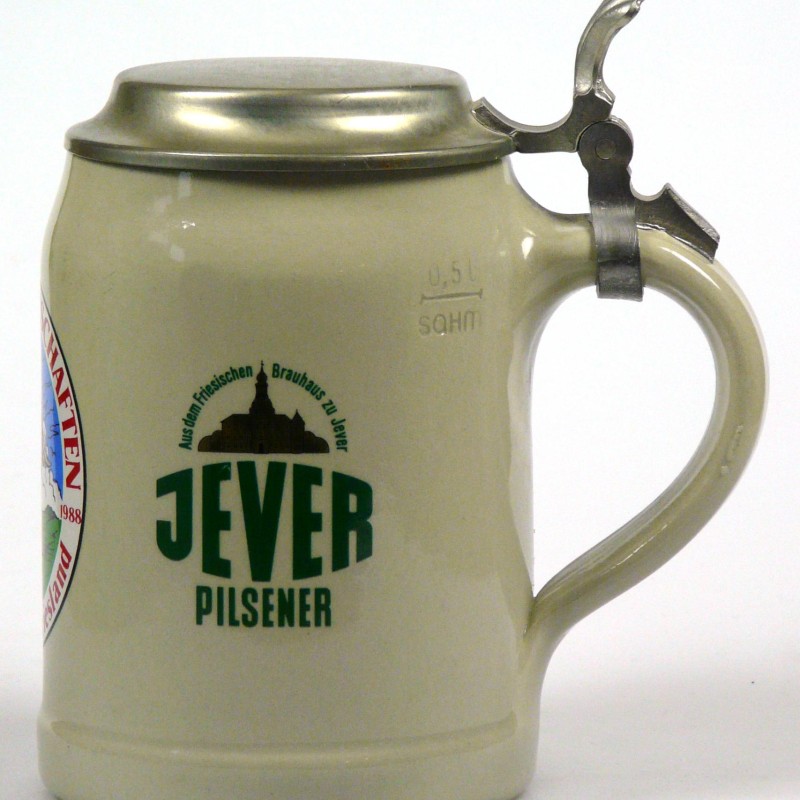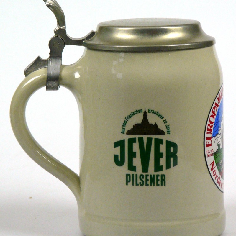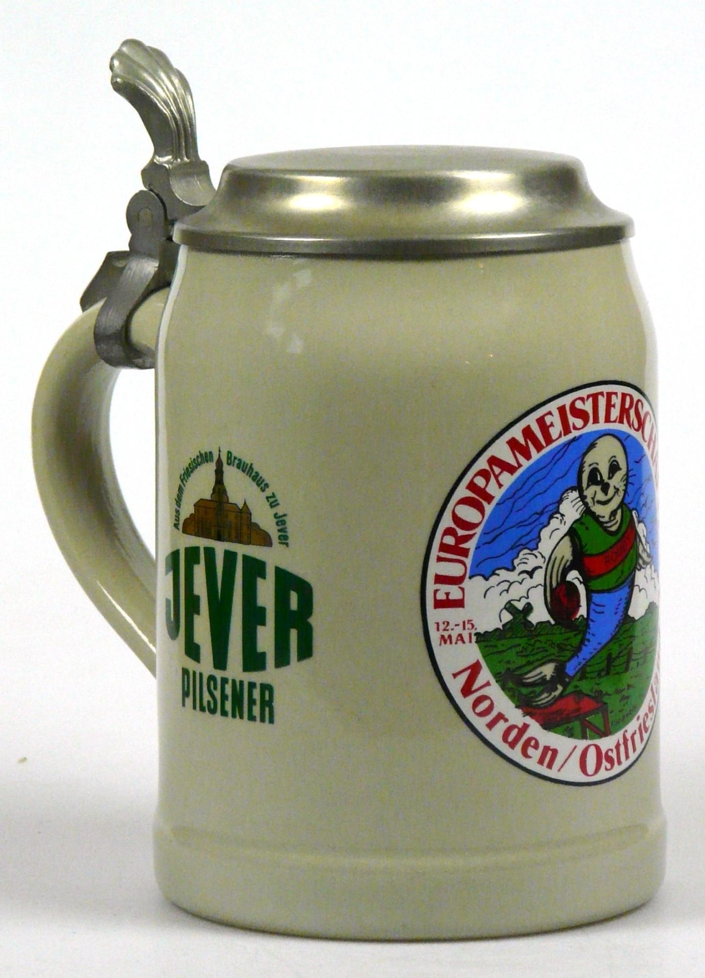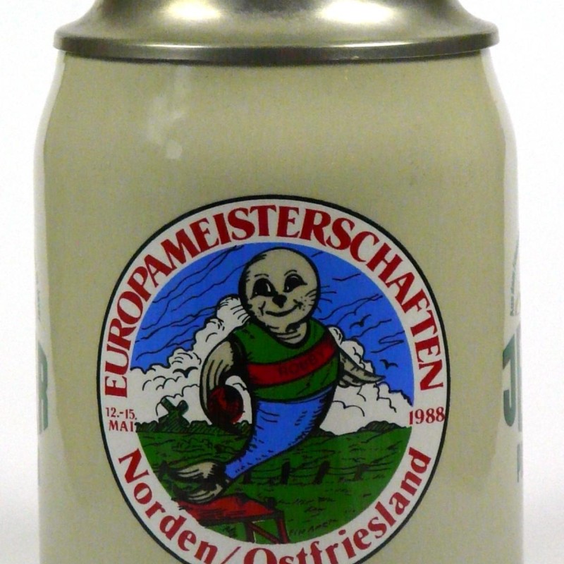 Ein paar Fakten von einem Insider: der Bierkrug wurde speziell für die Europameisterschaften der Klootschießer und Boßler in sehr geringer Stückzahl hergestellt. An den Wettkämpfen haben Sportler aus Ostfriesland/Oldenburg, Schleswig-Holstein, Holland und Irland teilgenommen. Dieser Krug war nicht im freien Handel erhältlich; es gab ihn nur im speziellen Souvenirshop auf dem Gelände zu erwerben, wo er damals schon am ersten Tag ausverkauft war.