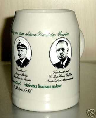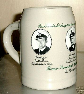 Zur Verabschiedung aus dem aktiven Dienst der Marine / Vizeadmiral Günther Fromm Befehlshaber der Flotte / Vizeadmiral Ansgar Bethge Inspekteur der Marine / Konteradmiral Dr.-Ing- Horst Goffer Amtschef des Marineamtes / Bremer Stammtisch / Friesisches Brauhaus zu Jever / 6. März 1985