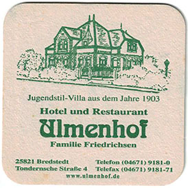 Attribut Wert Alter (min.) Alter (max.) Identifikation (Jever-Fan) ID I002795 / B1663 / S2 Typ Bierdeckel Identifikation (FvB/BDM) Kategorie Gastronomie Vorderseite 8-16 Attribute (Allgemein) Form Quadratisch Gastronomie Ulmenhof Logo Dachmarke 6 Maße HxBxT (cm) 9,3x9,3x0,1 Material Papier/Pappe Ort Bredstedt > Bredstedt > Kreis Nordfriesland > Schleswig-Holstein > Deutschland Sorte (Dachmarke)