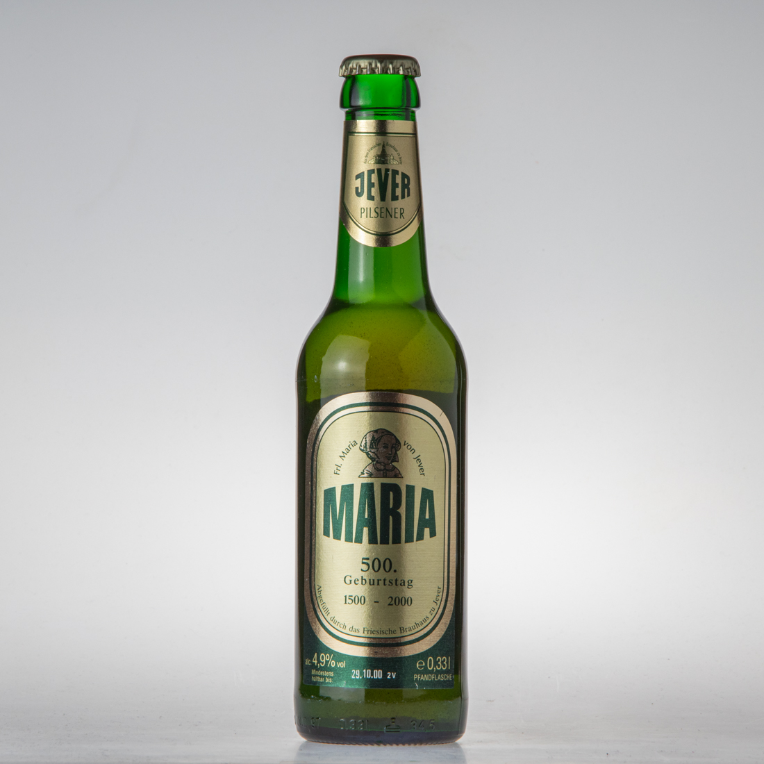 Aus dem Friesischen Brauhaus zu Jever / JEVER / PILSENER / Frl. Maria von Jever / MARIA / 500. Geburtstag / 1500-2000 / Abgefüllt durch das Friesische Brauhaus zu Jever / alc. 4,9% vol e 0,33l / Mindestens haltbar bis: / PFANDFLASCHE