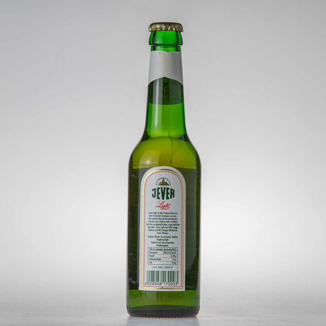 Aus dem Friesischen Brauhaus zu Jever / JEVER / Light / Jever Light ist das Premium-Bier aus dem Friesischen Brauhaus zu Jever. Das weiche friesische Brunnenwasser und eine Spur Hopfen mehr verleihen ihm den einzigartig herben, ursprünglichen Charakter. Jever Light hat 40% weniger Kalorien und 40% weniger Alkohol als Jever Pilsener. / Zutaten: Wasser, Gerstenmalz, Hopfen, Hopfenextrakt / Gebraut nach dem Deutschen Reinheitsgebot / 100ml enthalten durchschnittlich: Brennwert 104kJ (25kcal) Eiweß 0,29g Kohlenhydrate 1,9g Fett 0,0g / 26441 JEVER, GERMANY / 4 008948 170003