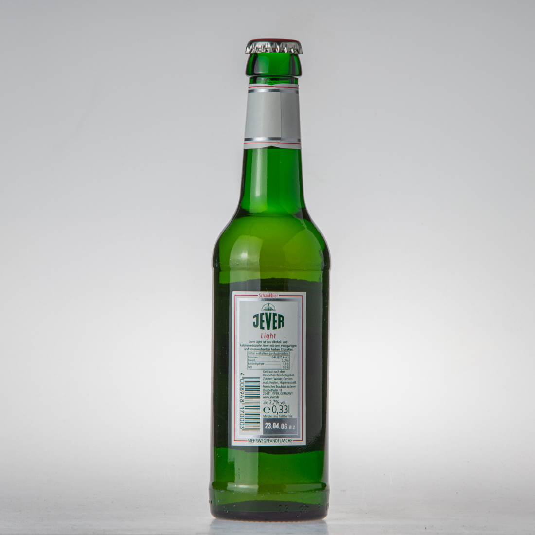 Schankbier / Friesisches Brauhaus / JEVER / Light / Jever Light ist das alkohol- und kalorienreduzierte Jever mit dem einzigartigen und unverwechselbar herben Charakter. / 100ml enthalten durchschnittlich: Brennwert 104kJ (25kcal) Eiweiß 0,29g Kohlenhydrate 1,9g Fett 0,0g / Gebraut nach dem Deutschen Reinheitsgebot. / Zutaten: Wasser, Gerstenmalz, Hopfen, Hopfenextrakt. / Friesisches Brauhaus zu Jever Elisabethufer 18 26441 JEVER, GERMANY www.jever.de / alc. 2,7% vol. / e 0,33l / Mindestens haltbar bis: / 4 008948 170003 / MEHRWEGPFANDFLASCHE