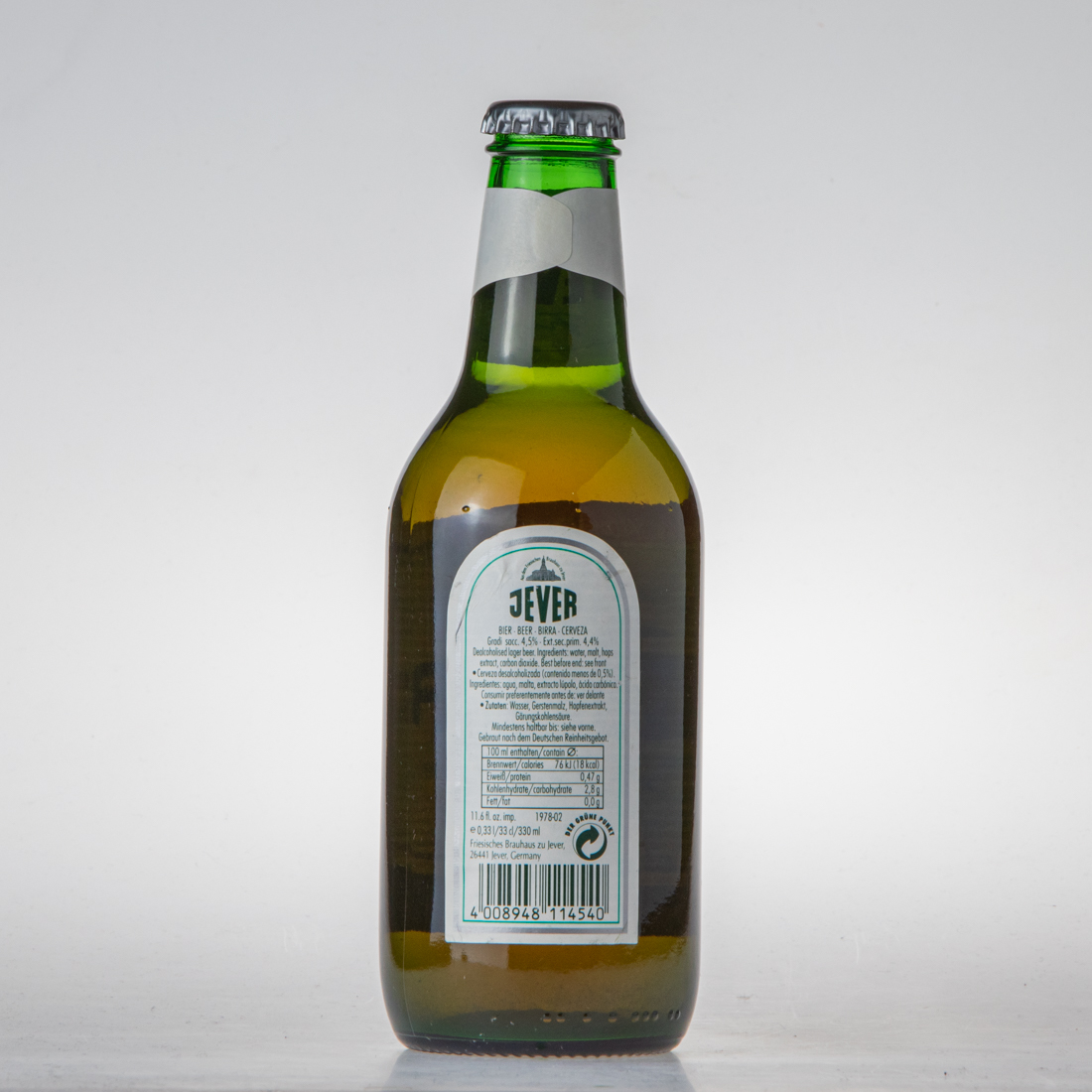 Aus dem Friesischen Brauhaus zu Jever / JEVER / BIER BEER BIRRA CERVEZA / Gradi sacc. 4,5% Ext. sec. prim. 4,4% Dealcoholised lager beer. Ingredients: water, malt, hops extract, carbon dioxide. Best before end: see front / Cerveza desalcoholizada (contenido menos de 0,5%). Ingredientes: agua, malta, extracta lupolo, acida carbonico. Consumir preferentemente antes de: ver delante / Zutaten: Wasser, Gerstenmalz, Hopfenextrakt, Gärungskohlensäure / Mindestens haltbar bis: siehe vorne / Gebraut nach dem Deutschen Reinheitsgebot. / 100ml enthalten / contain Brennwert/calories 76kJ (18kcal) Eiweiß/protein 0,47g / Kohlenhydrate/carbohydrate 2,8g Fett/fat 0,0g / 11.6 fl. oz. imp. 1978-02 / e 0,33l/33cl/330ml / DER GRÜNE PUNKT / Friesisches Brauhaus zu Jever, 26441 Jever, Germany / 4 008948 114540