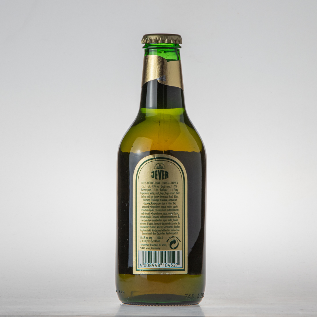 Aus dem Friesischen Brauhaus zu Jever / JEVER / BEER … BIRRA CERVEZA CERVEJA / Cat. I alc 4,9% vol Gradi sacc. 11,9% Ext. sec. prim. 11,4% … 11,4 … Ingredients: water, malt, hops, hops extract. Best before end: see front … Ingredienti: acqua malto lupolo extracto di lupolo de consumarsi preferibilmente: vedi davanti Ingredientes: aqua malta lupolo extractas di lupolo Consumir de preferencia antes de: ver adiante Zutaten: Wasser, Gerstenmalz, Hopfen, Hopfenextrakt. Mindestens haltbar bis: siehe vorne. Gebraut nach dem Deutschen Reinheitsgebot. / 11.6 fl. oz. imp. 1506-3 / e 0,33l/33cl/330ml / Friesisches Brauhaus zu Jever, 26441 Jever, Germany / DER GRÜNE PUNKT / 4 008948 104527