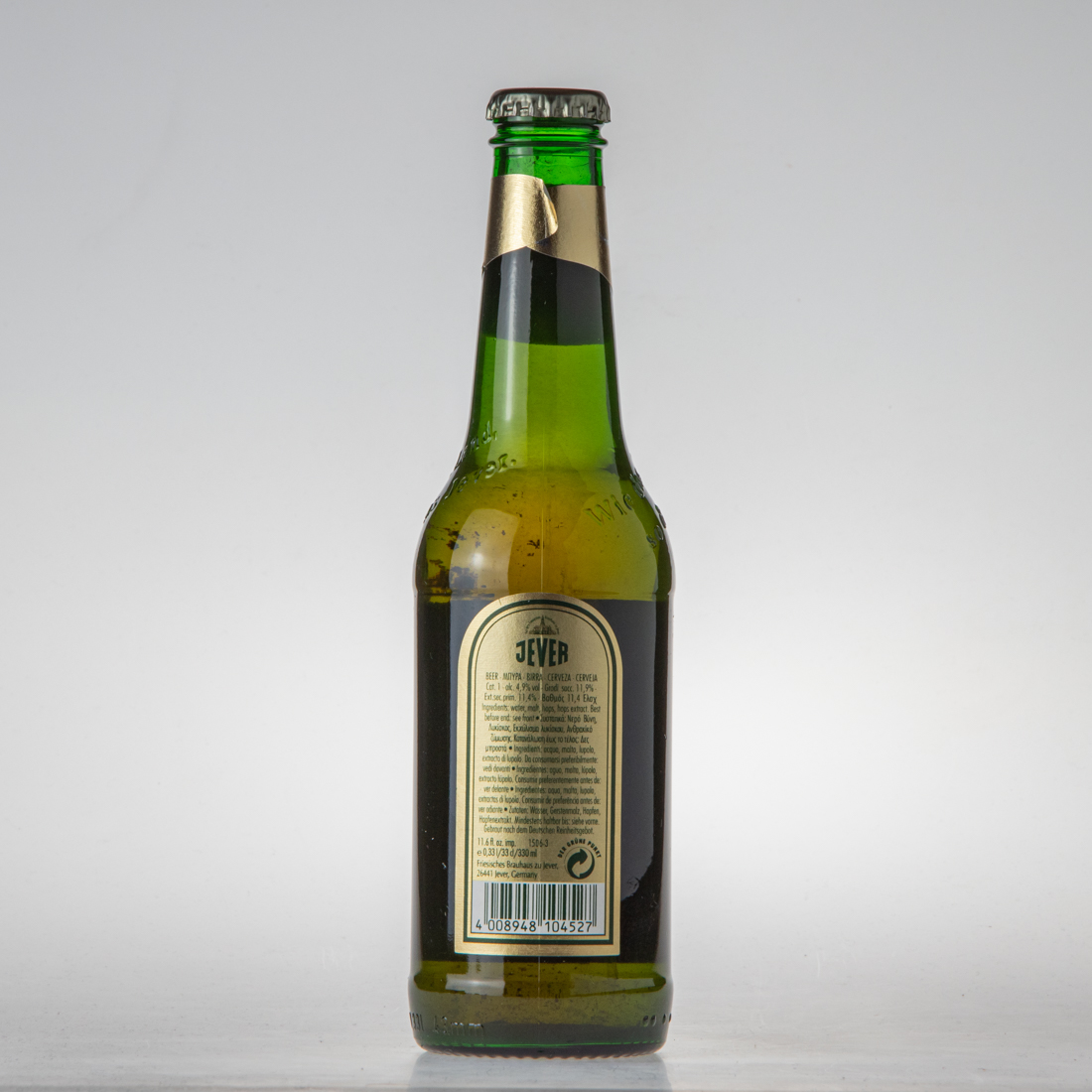 Aus dem Friesischen Brauhaus zu Jever / JEVER / BEER … BIRRA CERVEZA CERVEJA / Cat. I alc 4,9% vol Gradi sacc. 11,9% Ext. sec. prim. 11,4% … 11,4 … Ingredients: water, malt, hops, hops extract. Best before end: see front … Ingredienti: acqua malto lupolo extracto di lupolo de consumarsi preferibilmente: vedi davanti Ingredientes: aqua malta lupolo extractas di lupolo Consumir de preferencia antes de: ver adiante Zutaten: Wasser, Gerstenmalz, Hopfen, Hopfenextrakt. Mindestens haltbar bis: siehe vorne. Gebraut nach dem Deutschen Reinheitsgebot. / 11.6 fl. oz. imp. 1506-3 / e 0,33l/33cl/330ml / Friesisches Brauhaus zu Jever, 26441 Jever, Germany / DER GRÜNE PUNKT / 4 008948 104527