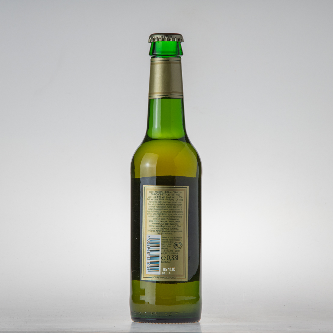BEER STARKÖL BIRRA CERVEZA … / Cat. I alc. 4,9% vol Gradi sacc. 11,9% Ext. Sec. Prim. 1,4% … 1,4 … / Ingredients: water, malt, hops extract, hops. Best before: se below INgredienser: vatten, kommalt, humleextrakt, humle. Bäst före: se nedan. Ingredienti: acqua, malto, estratto di luppolo, luppolo. Da consumarsi preferibilmente entro: v. sotto INgredientes: agua, malta, extracto de lupolo, lupolo Consumir preferentemente antes: ver abajo … / Brewed in strict accordance with the Reinheitsgebot” / Friesisches Brauhaus zu Jever 26441 Jever, Germany / 11.6 fl. oz. imp. / e 0,33l/33cl/330ml / e 0,33l / Best before: / 4 008948 121005 / NON-RETURNABLE BOTTLE