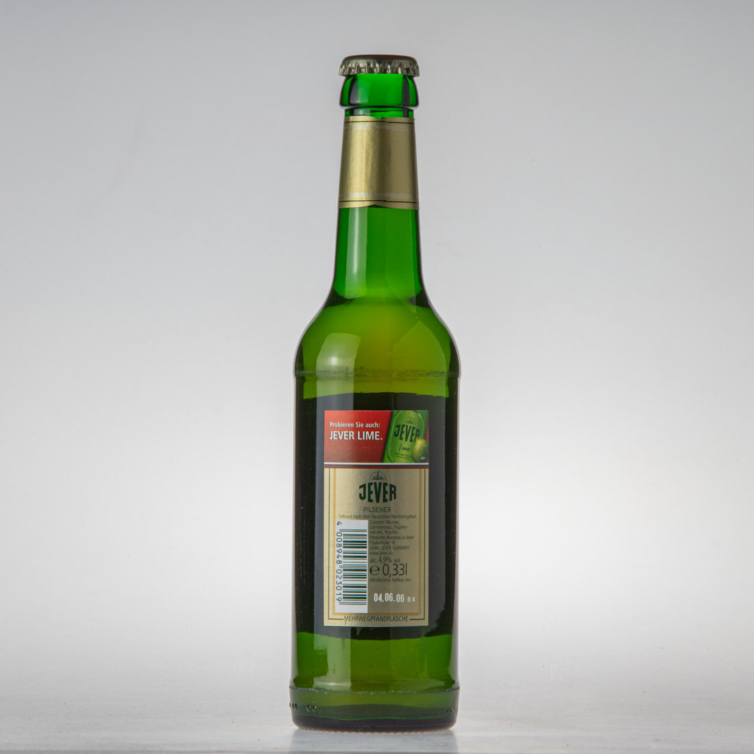 Probieren Sie auch: JEVER LIME. / Friesisches Brauhaus / JEVER / PILSENER / Gebraut nach dem Deutschen Reinheitsgebot. / Zutaten: Wasser, Gerstenmalz, Hopfenextrakt, Hopfen / Friesisches Brauhaus zu Jever Elisabethufer 18 26441 JEVER, GERMANY www.jever.de / alc. 4,9% vol / e 0,33l / MIndestens haltbar bis: / 4 008948 023019 / MEHRWEGPFANDFLASCHE