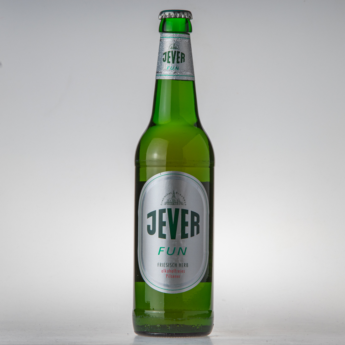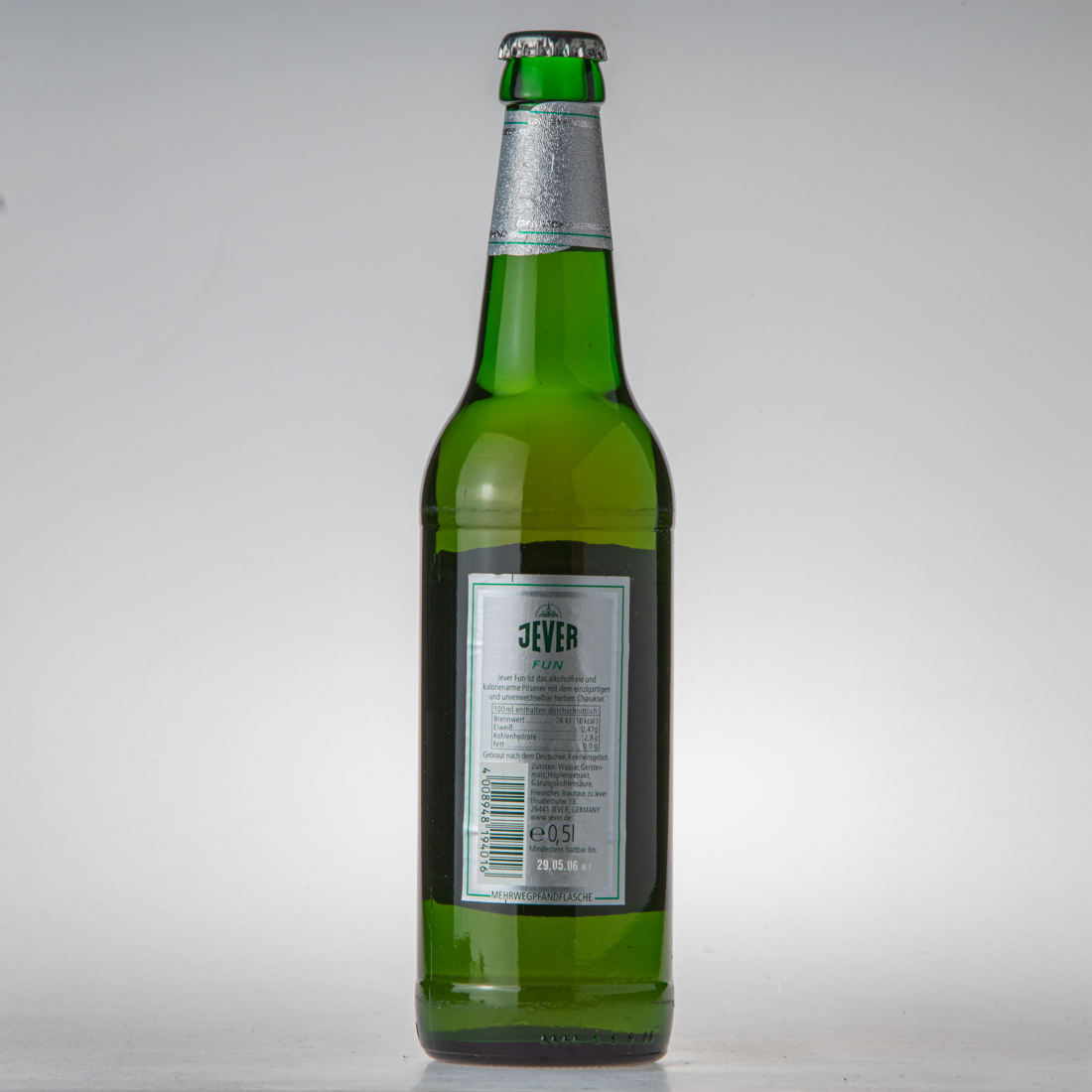 Friesisches Brauhaus / JEVER / FUN / Jever Fun ist das alkoholfreie und kalorienarme Pilsener mit dem einzigartigen un unverwechselbar herben Charakter. / 100ml enthalten durchschnittlich Brennwert 76kJ (18kcal) Eiweiß 0,47g Kohlenhydrate 2,8g Fett 0,0g / Gebraut nach dem Deutschen Reinheitsgebot / Zutaten: Wasser, Gerstenmalz, Hopfenextrakt, Gärungskohlensäure / Friesisches Brauhaus zu Jever Elisabethufer 18 26441 JEVER, GERMANY www.jever.de / e 0,5l / Mindestens haltbar bis: / MEHRWEGPFANDFLASCHE / 4 008948 194016