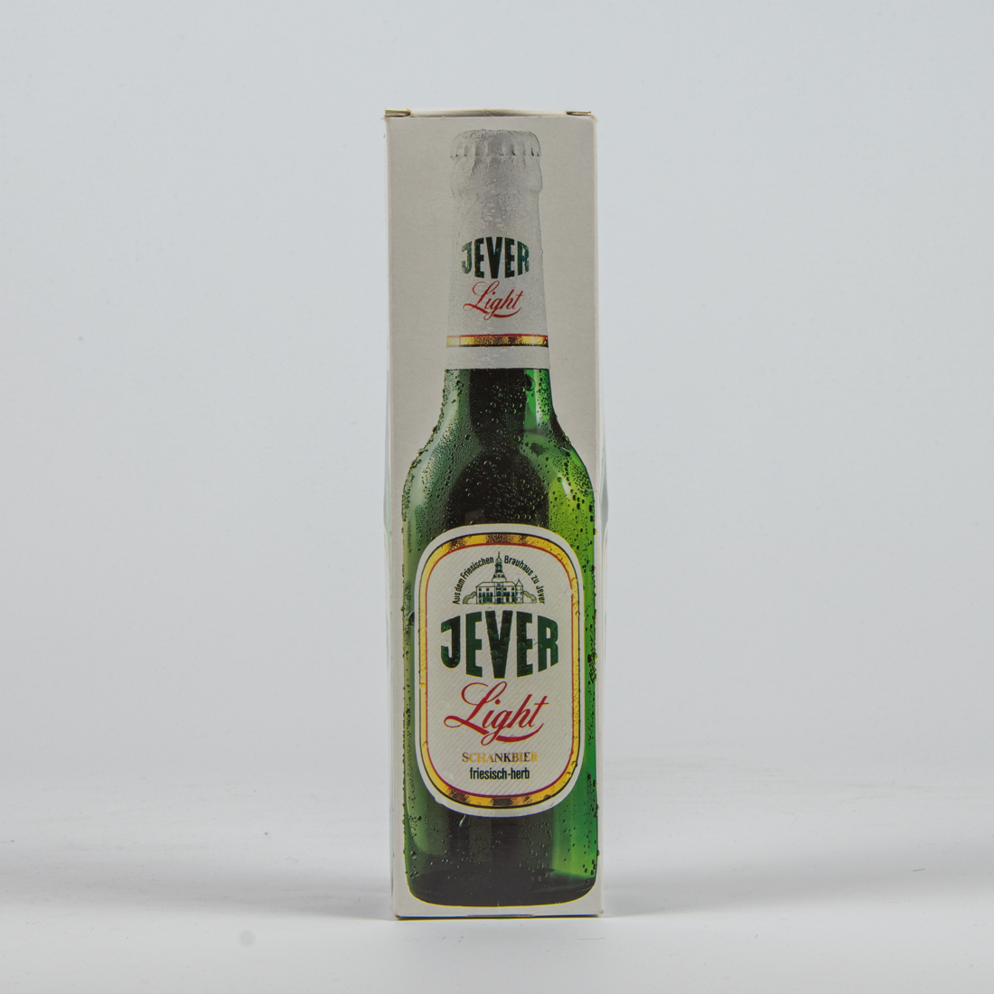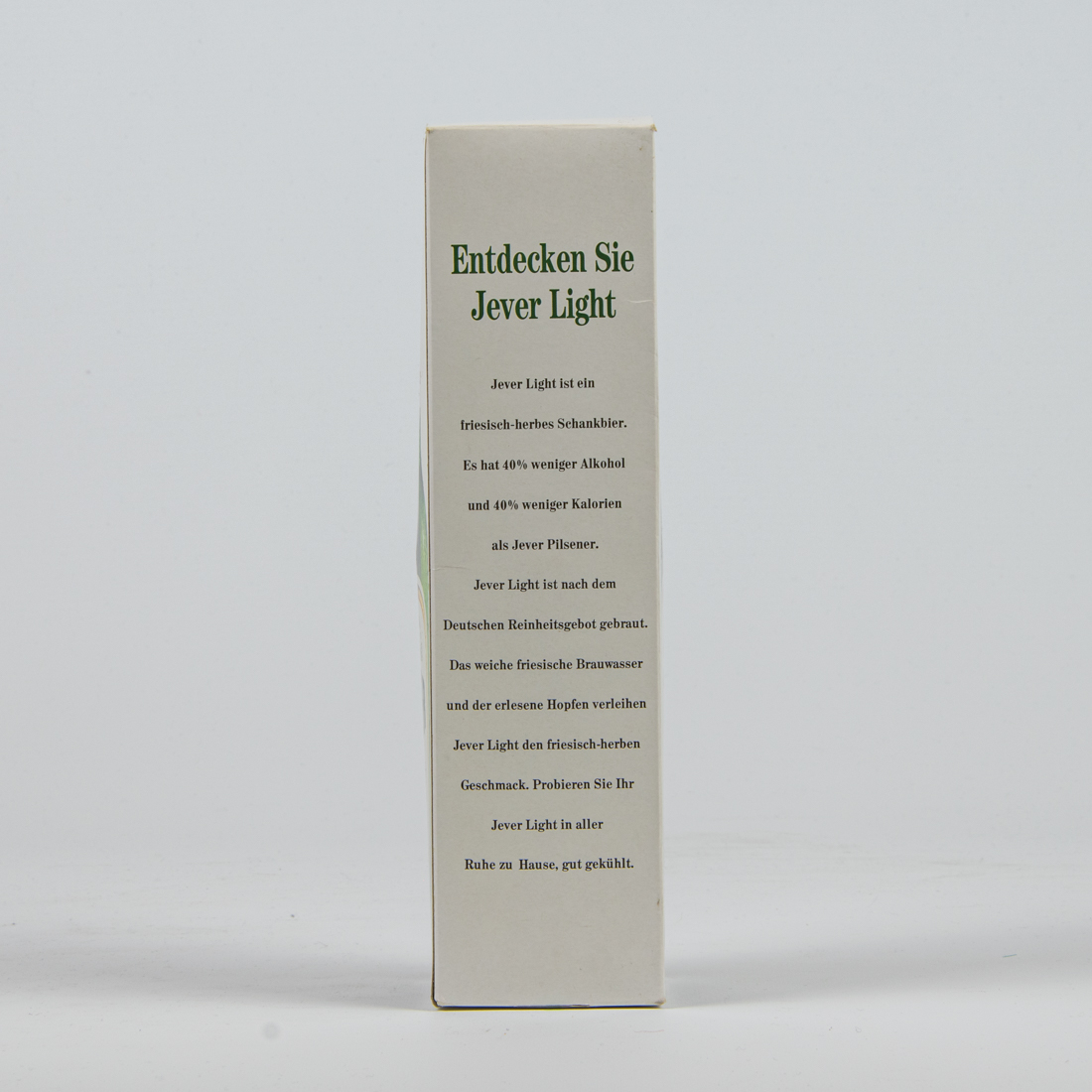 In diesen Kartons war jeweils eine Flasche Jever Light (siehe S0434) eingepackt. Der Karton mit der Flasche war eine sogenannte “Kastenbeilage”, welche beim Kauf eines Kasten Jever gratis dazugegeben wurde. Zeitpunkt der Ausgabe war vermutlich die Markteinführung von Jever Light, um den Kunden das neue Produkt vorzustellen.