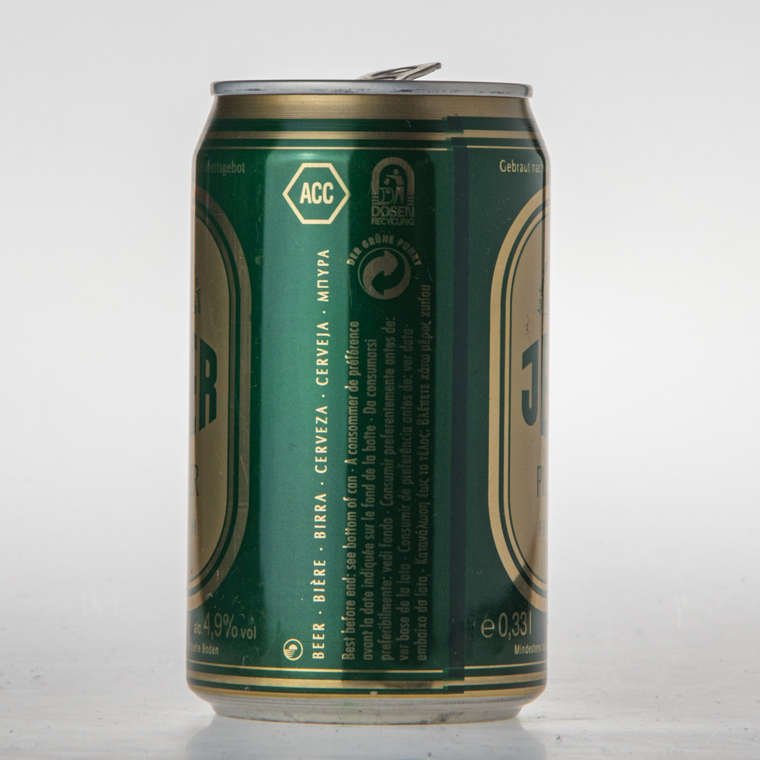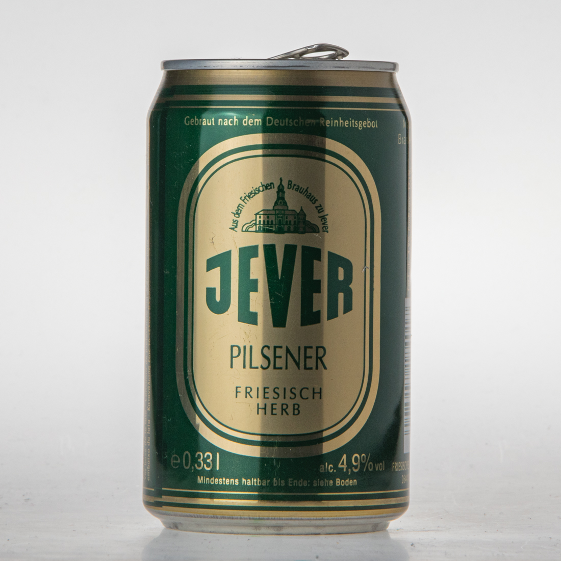 BEER BIERE BIRRA CERVEZA CERVEJA … / Best before end: see bottom of can / A consommer de preference avant la date indiquee sur le fond de la boite / Da consumarsi preferibilmente: vedi fondo / Consumir preferentemente antes de: ver base de la lata / Consumr de preferencia antes de: ver data embaixo da lata / … / ACC DOSEN RECYCLING DER GRÜNE PUNKT / CAT I, alc. 4,9% Gradi sacc. 12,1% Ext. sec. prim. 11,6% … 11,6 … / 11.6 fl. oz. imp. 0,33l 33cl 330ml / Made in Germany Brassee en Allemagne / FRIESISCHES BRAUHAUS ZU JEVER 26441 JEVER, GERMANY / 4 008948 184017