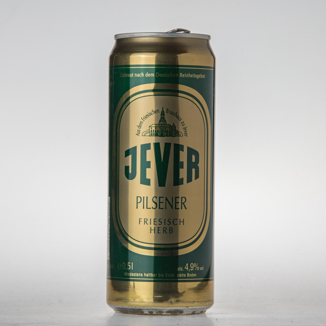 BEER BIERE BIRRA CERVEZA CERVEJA … / CAT I, alc. 4,9% Gradi sacc. 12,1% Ext. sec. prim. 11,6% … 11,6 … / 17.6 fl. oz. imp. 0,5l 50cl 500ml / Made in Germany Brassee en Allemagne / FRIESISCHES BRAUHAUS ZU JEVER D-2942 JEVER / 4 008948 161025 / Best before end: see bottom of can / A consommer de preference avant la date indiquee sur le fond de la boite / Da consumarsi preferibilmente: vedi fondo / Consumir preferentemente antes de: ver base de la lata / Consumr de preferencia antes de: ver data embaixo da lata / … / ACC DOSEN RECYCLING DER GRÜNE PUNKT / Kühl lagern
