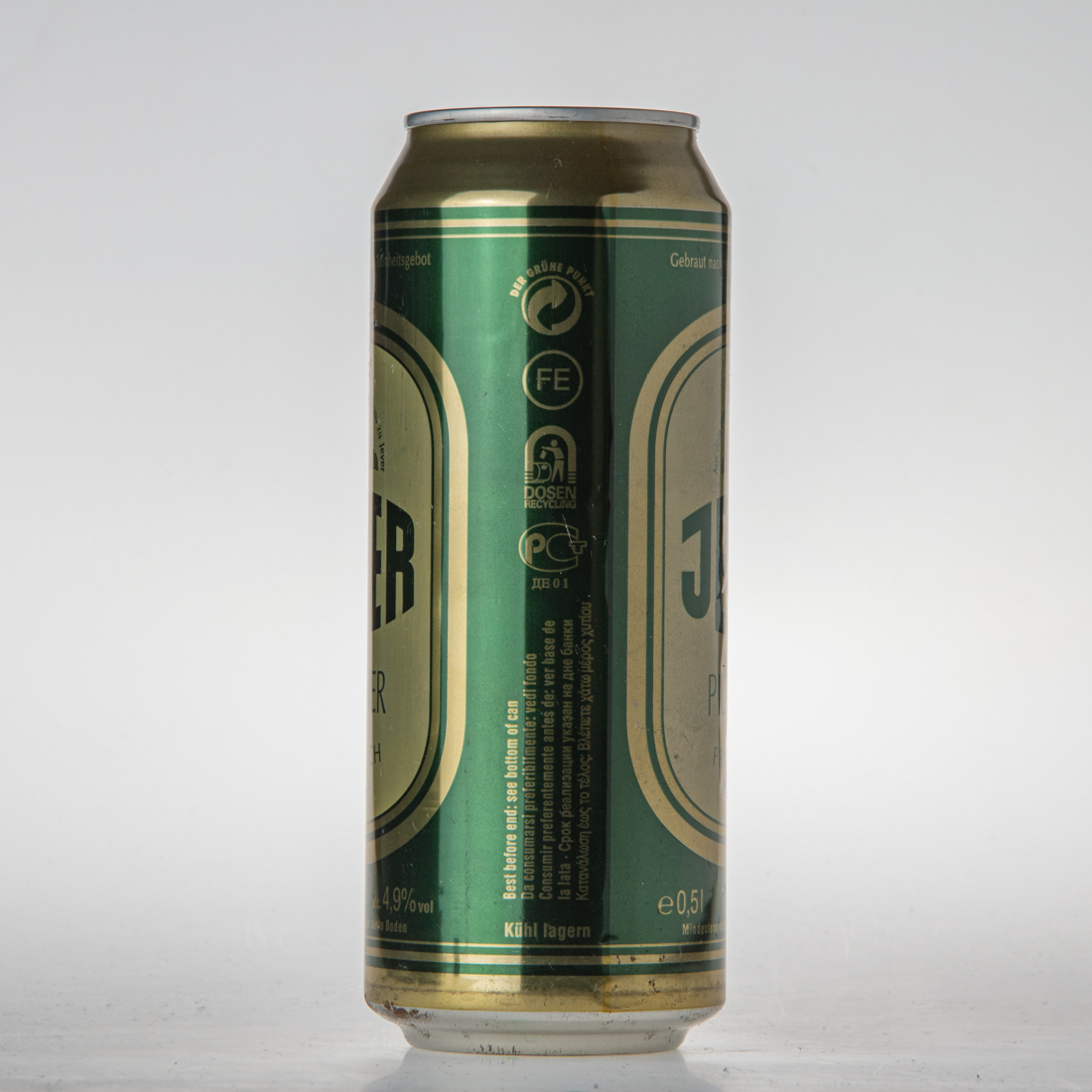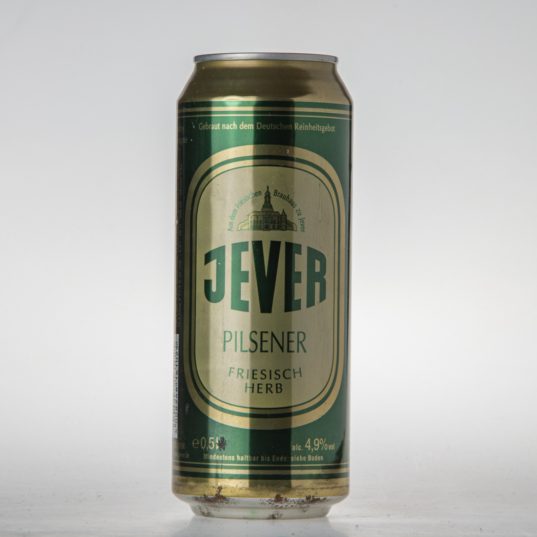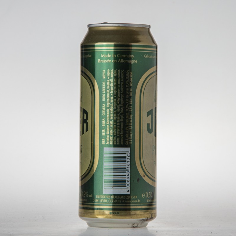 BIER BEER BIRRA CERVEZA … / Zutaten: Wasser, Gerstenmalz, Hopfenextrakt, Hopfen / Ingredients: water, malt, hops extract, hops / Ingredienti: acqua, malto, extracto de lupolo, lupolo / Ingredientes: agua, malta, extracto de lupolo, lupolo / … / CAT I, alc. 4,9% Gradi sacc. 11,9% Ext. sec. prim. 11,4% … 11,4 … / 11.6 fl. oz. imp. 0,5l 50cl 500ml / … / Made in Germany Brassee en Allemagne / FRIESISCHES BRAUHAUS ZU JEVER 26441 JEVER, GERMANY www.jever.de / 4 008948 161025 / Best before end: see bottom of can / Da consumarsi preferibilmente: vedi fondo / Consumir preferentemente antes de: ver base de la lata / … / FE DOSEN RECYCLING DER GRÜNE PUNKT / Kühl lagern