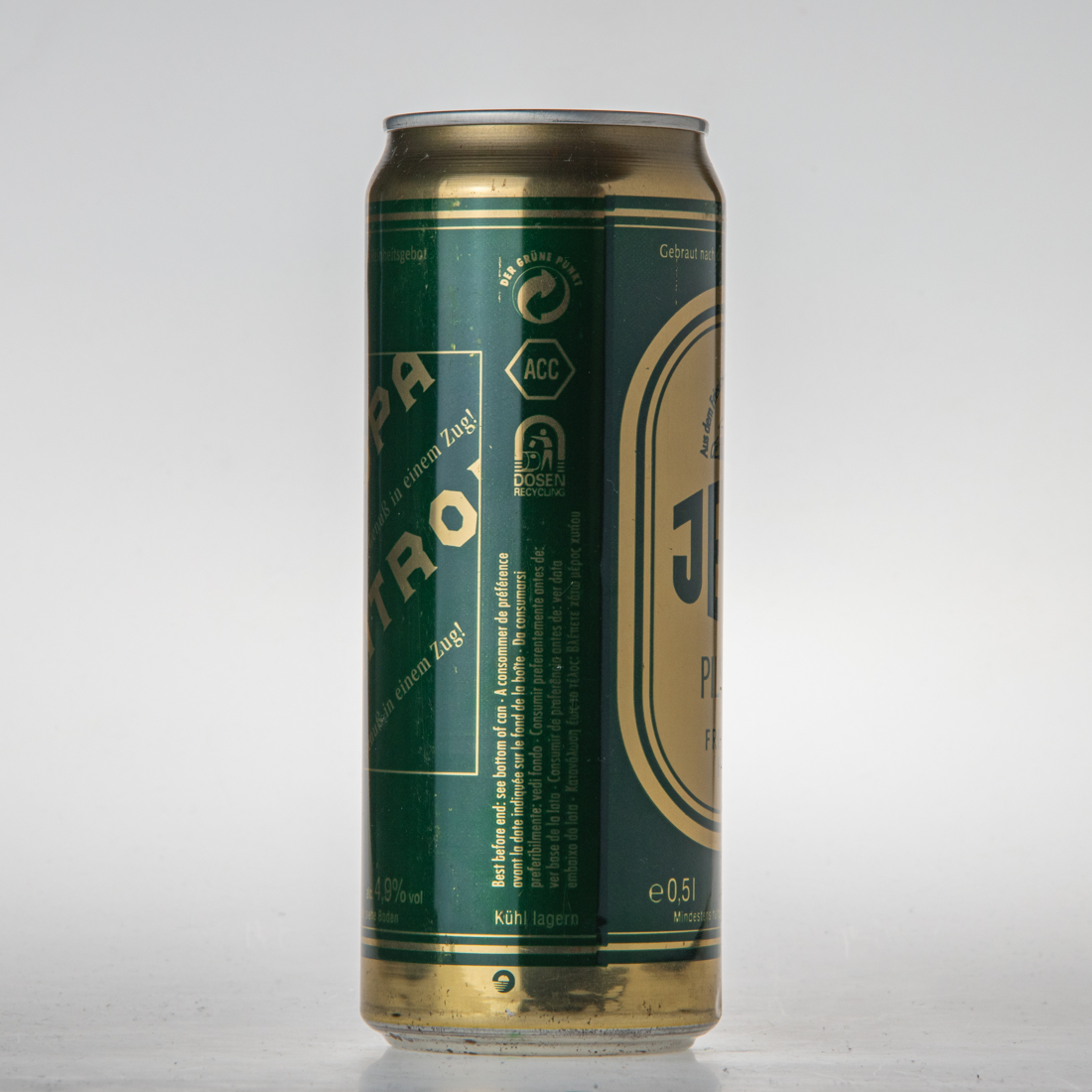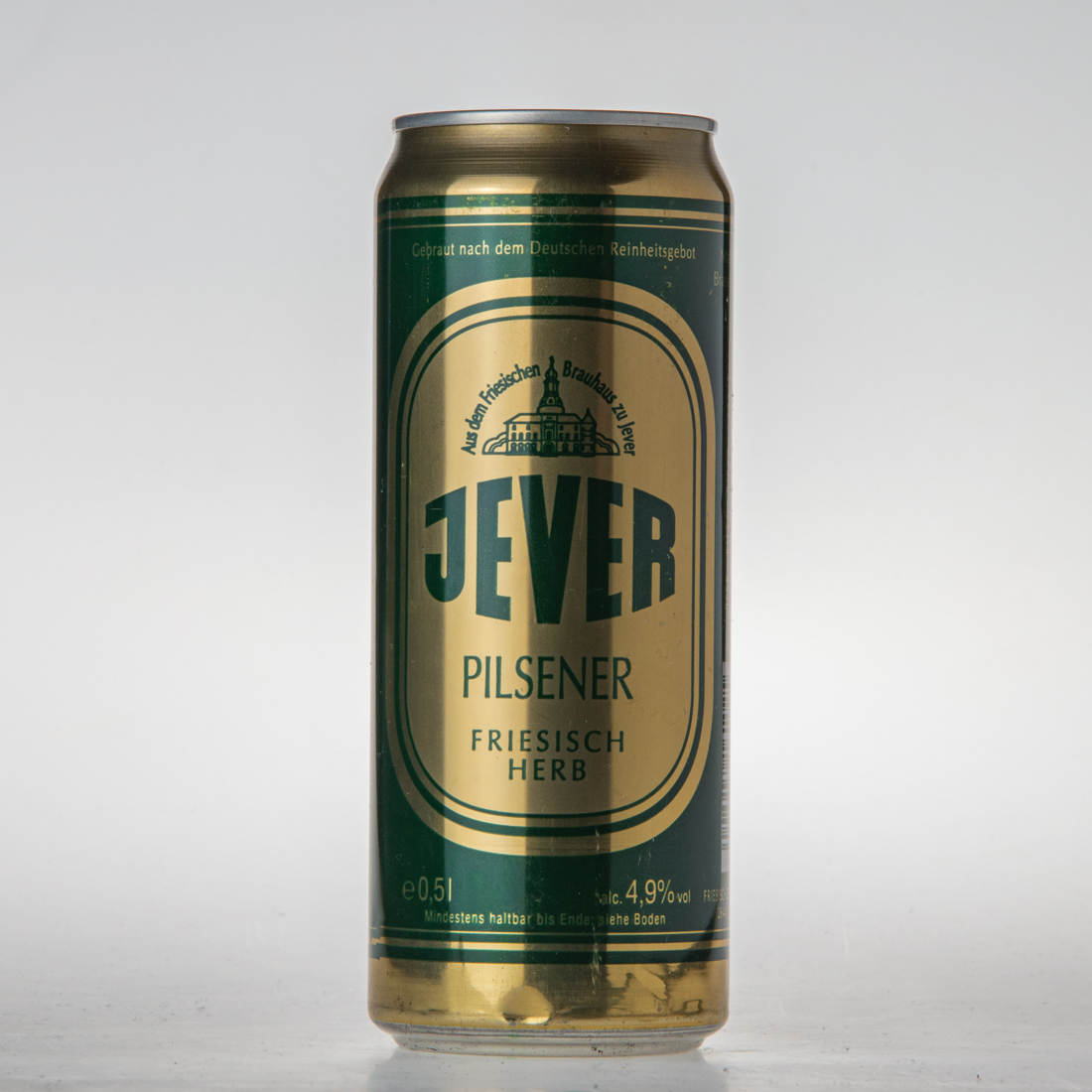BEER BIERE BIRRA CERVEZA CERVEJA … / CAT I, alc. 4,9% Gradi sacc. 11,9% Ext. sec. prim. 11,4% … 11,4 … / 17.6 fl. oz. imp. 0,5l 50cl 500ml / Made in Germany Brassee en Allemagne / FRIESISCHES BRAUHAUS ZU JEVER 26441 JEVER, GERMANY / 4 008948 161025 / Best before end: see bottom of can / A consommer de preference avant la date indiquee sur le fond de la boite / Da consumarsi preferibilmente: vedi fondo / Consumir preferentemente antes de: ver base de la lata / Consumr de preferencia antes de: ver data embaixo da lata / … / ACC DOSEN RECYCLING DER GRÜNE PUNKT / Kühl lagern