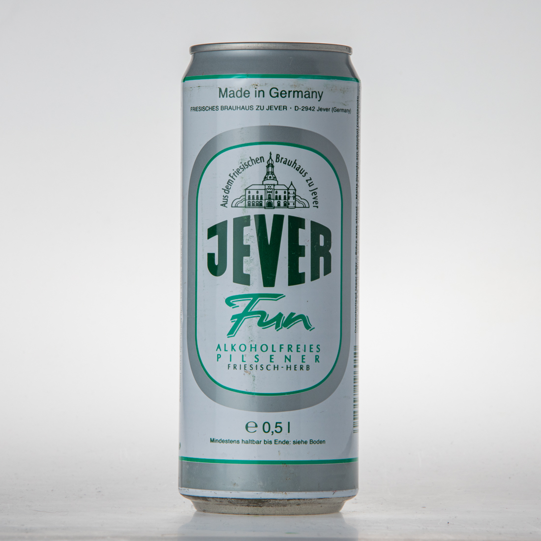 Made in Germany / FRIESISCHES BRAUHAUS ZU JEVER D-2942 Jever (Germany) / Aus dem Friesischen Brauhaus zu Jever / JEVER / Fun / ALKOHOLFREIES PILSENER / FRIESISCH-HERB / e 0,5l / Mindestens haltbar bis Ende: siehe Boden