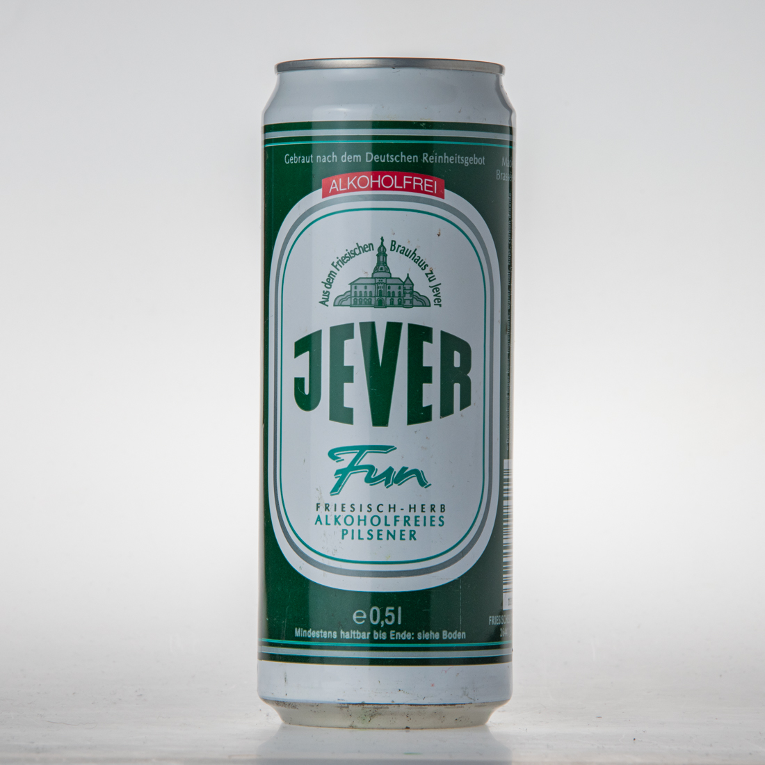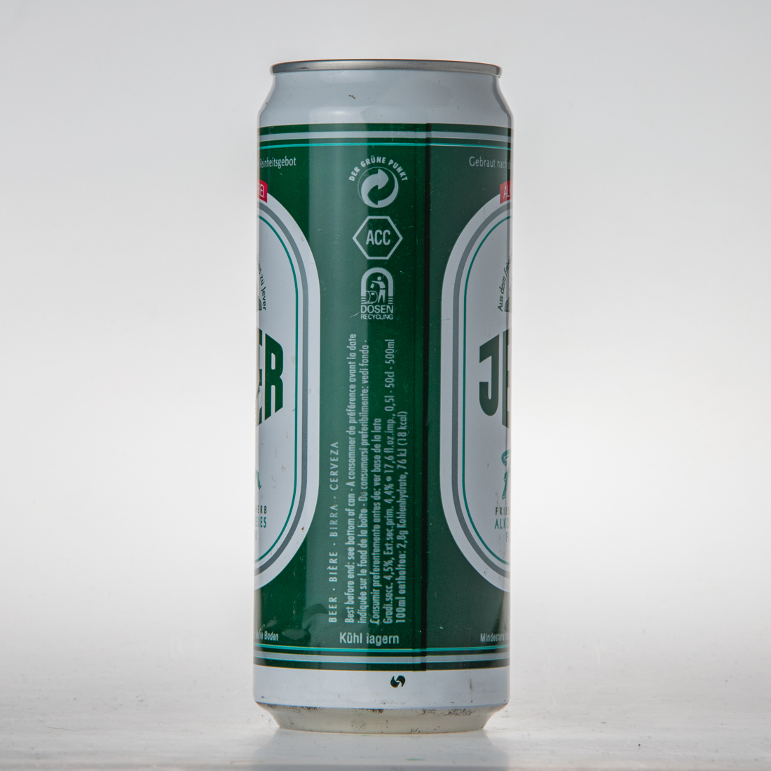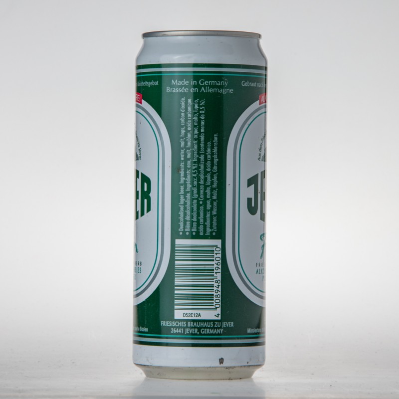 BEER BIERE BIRRA CERVEZA / Best before end: see bottom of can Consommer de preference avant de la date indiquee sur le fond de la boite Da consumarsi preferibilmente: vedi fondo Consumir preferentemente antes de: ver base de la lata Gradi.sacc. 4,5%, Ext.sec.prim. 4,4% 17,6 fl.oz.imp., 0,5l 50cl 500ml / 100ml enthalten: 2,8g Kohlenhydrte, 76kJ (18kcal) / DER GRÜNE PUNKT ACC DOSEN RECYCLING / Kühl lagern / Made in Germany / Brassee en Allemagne / Dealocoholized lager beer Ingredients: water, malt, hops extract, carbon dioxide / Biere desalcoholisee Ingredients: eau, malt, houblon, acide carbonique Birra dealcoolata (gradi.sacc. 4,5%) Ingredienti: acqua, malta, lupolo, acido carbonico / Cerveza desalcoholizada (contenido menos de 0,5%) Ingredientes: agua, malta, extracto lupolo, acido carbonico / Zutaten: Wasser, Gerstenmalz, Hopfenextrakt, Gährungskohlensäure / 4 008948 196010 / FRIESISCHES BRAUHAUS ZU JEVER 26441 JEVER, GERMANY