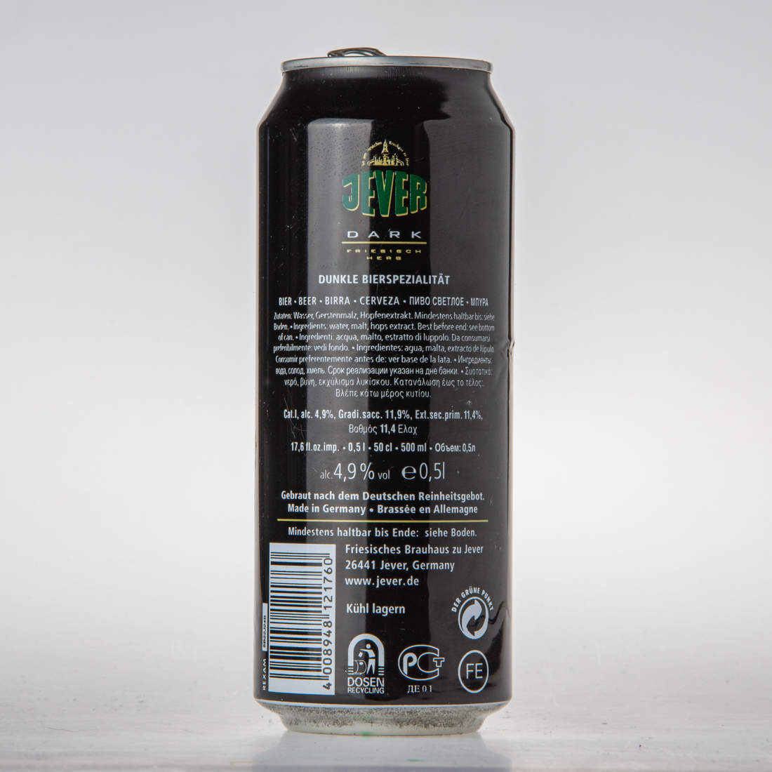 Aus dem Friesischen Brauhaus zu Jever / JEVER / DARK / DUNKLE BIERSPEZIALITÄT / BIER BEER BIRRA CERVEZA … / Zutaten: Wasser, Gerstenmalz, Hopfenextrakt. Mindestens haltbar bis: siehe Boden. / Ingredients: water, malt, hops extract. Best before end: see bottom of can. / Ingredienti: acqua, malto, estratto di lupolo. Da consumarsi preferibilmente: vedi fondo. / Ingredientes: agua, malta, extracto de lupulo. Consumir prefrentemente antes des: ver base de la lata. / … / Cat. I, alc. 4,9%, Gradi.sacc. 11,9%, Ext.sec.prim. 11,4%, … / 17,6 fl.oz.imp. 0,5l 50cl 500ml … / alc. 4,9% vol e 0,5l / Gebraut nach dem Deutschen Reinheitsgebot. / Made in Germany Brassee en Allemagne / Mindestens haltbar bis Ende: siehe Boden. / Friesisches Brauhaus zu Jever 26441 Jever, Germany www.jever.de / Kühl lagern / DER GRÜNE PUNKT DOSEN RECYCLING FE
