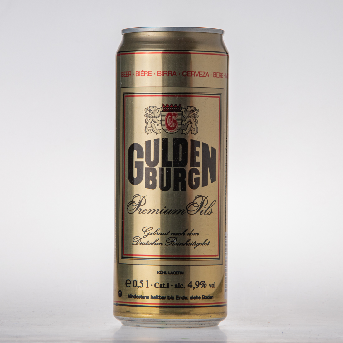BEER BIERE BIRRA CERVEZA BERE / GULDENBURG Premium Pils / Gebraut nach dem Deutschen Reinheitsgebot / KÜHL LAGERN / e 0,5l Cat. I alc. 4,9% vol / Mindestens haltbar bis Ende: siehe Boden
