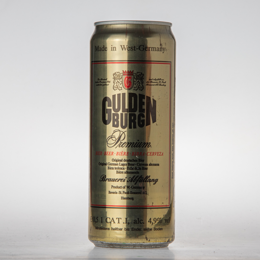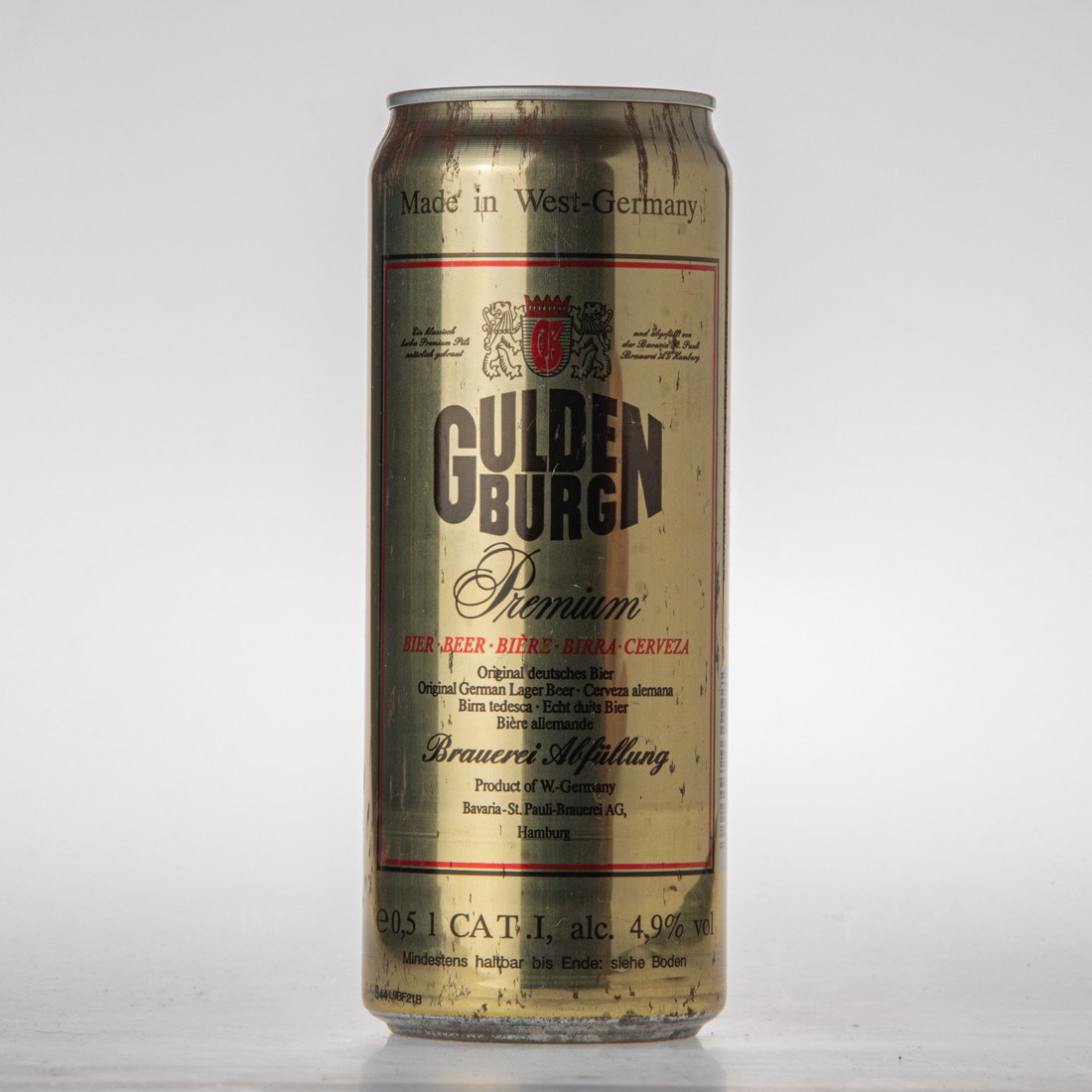Made in West-Germany / Ein klassisch herbes Premium Pils natürlich gebraut und abgefüllt von der Bavaria-St. Pauli Brauerei AG Hamburg / GULDENBURG / Premium / BIER BEER BIERE BIRRA CERVEZA / Original deutsches Bier Original German Lager Cerveza alemana Birra tedesca Echt duits Bier Biere allemande / Brauerei Abfüllung / Product of W.-Germany / Bavaria-St.Pauli-Brauerei AG, Hamburg / e 0,5l CAT. I, alc. 4,9% vol / Mindestens haltbar bis Ende: siehe Boden