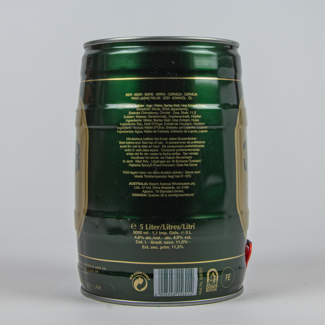 BIER BEER BIERE BIRRA CERVEZA CERVEJA PIWO JASNE PELNE SÖR STARKÖL ÖL / Für Austria: Vollbier Ingr.: Water, Barley Malt, Hop Extract, Hops / Skladniki: Woda, Slod Jeczmienny, Ekstrakt Chimielowy, Chmiel Zwa Ekstr. 11,2 / Zutaten: Wasser, Gerstenmalz, Hopfenextrakt, Hopfen Ingredients: Eau, Water, Barley Malt, Hop Extract, Hops, Ingredienti: Acqua, Malto D’Orzo, Extratto de Luppolo, Luppolo Ingredients: Agua, Malta de Cebada, Extracto de Lupulo, Lupulo / Mindestens haltbar bis Ende: siehe Dosendeckel / Best before end: see top of can / A consommer de preference aavant fin: voir la date en haut / Da consumarsi preferibilmente entro il: vedi data sopra / Consumir preferentemente antes del fin de: vease la fecha arriba / Ten minste houdbaar tot einde: zie Datum Bovenkant le Jarat Bäst före Utgängen av: Sie Burkens Överkant … / Kühl lagern bzw. vor dem Anstich kühlen - Serve cool Ideale Trinktemperatur liegt bei 8°-10° C / AUSTRALIA: Beach Avenue Wholesalers pty, Ltd., 47 Ind. Drive Braeside, vic 3195, Approx. 19 Standard drinks / CANADA: Quebec 20c consignee/refund / RUSSIA: … / e 5 Liter/Litres/Litri / alc. 4,9% vol./5% … 1,1 Imp. Gals / 5000ml 5x Cat. I 5lalc. 5% vol. / Cat. I, alc. 4,9% vol., Gradi sacc. 11,9% / Ext sec prim 11,4% / DER GRÜNE PUNKT / 4 008948 156014 / DOSEN RECYCLING / BUILT IN TAP / 1. Zapfen vorbereiten … / 2. Zapfen … / 3. Fass belüften … / Friesisches Brauhaus zu Jever Elisabethufer 18 26441 Jever, Germany www.jever.de