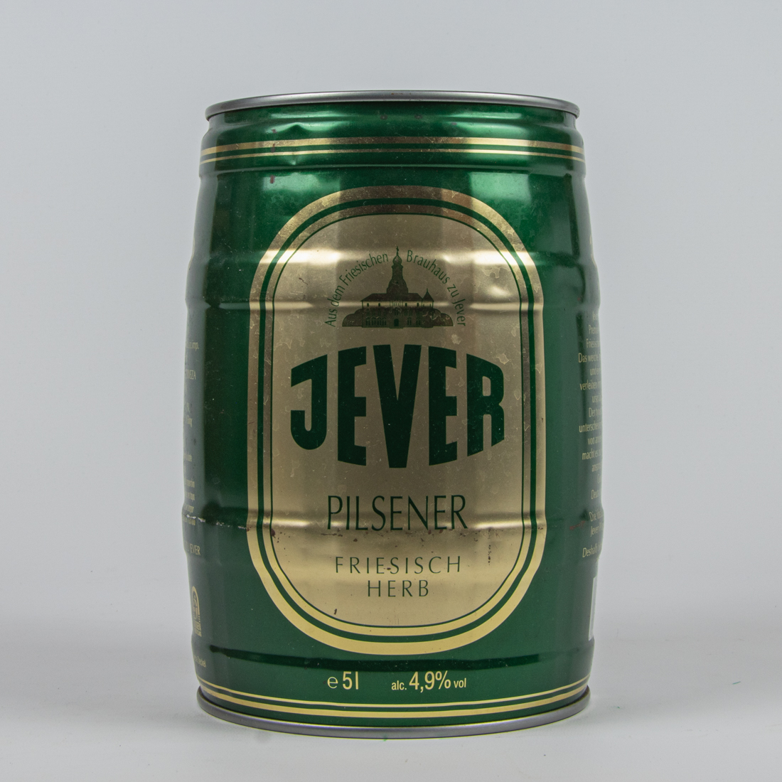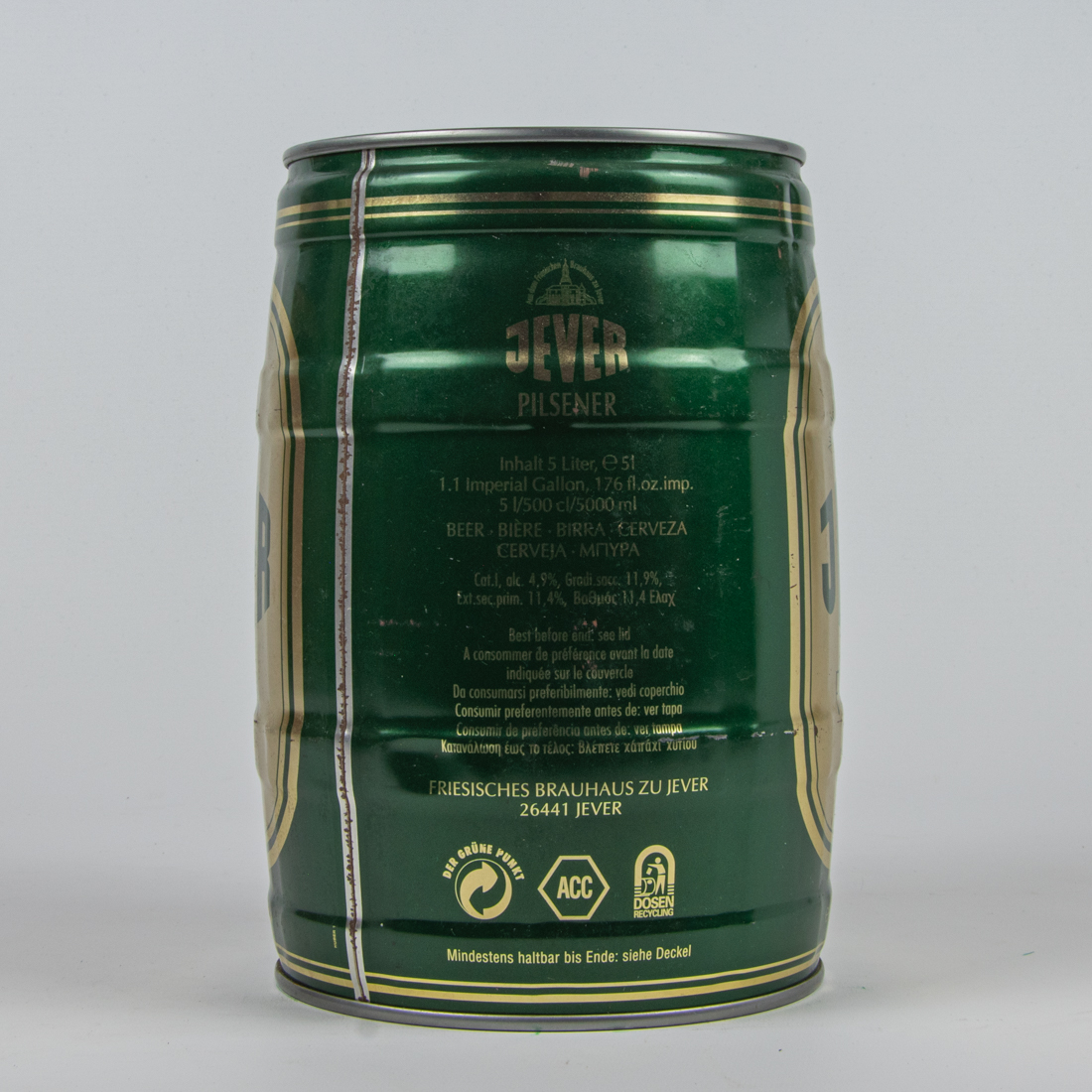 BIER BEER BIERE BIRRA CERVEZA CERVEJA PIWO JASNE PELNE SÖR STARKÖL ÖL / Für Austria: Vollbier Ingr.: Water, Barley Malt, Hop Extract, Hops / Skladniki: Woda, Slod Jeczmienny, Ekstrakt Chimielowy, Chmiel Zwa Ekstr. 11,2 / Zutaten: Wasser, Gerstenmalz, Hopfenextrakt, Hopfen Ingredients: Eau, Water, Barley Malt, Hop Extract, Hops, Ingredienti: Acqua, Malto D’Orzo, Extratto de Luppolo, Luppolo Ingredients: Agua, Malta de Cebada, Extracto de Lupulo, Lupulo / Mindestens haltbar bis Ende: siehe Dosendeckel / Best before end: see top of can / A consommer de preference aavant fin: voir la date en haut / Da consumarsi preferibilmente entro il: vedi data sopra / Consumir preferentemente antes del fin de: vease la fecha arriba / Ten minste houdbaar tot einde: zie Datum Bovenkant le Jarat Bäst före Utgängen av: Sie Burkens Överkant … / Kühl lagern bzw. vor dem Anstich kühlen - Serve cool Ideale Trinktemperatur liegt bei 8°-10° C / AUSTRALIA: Beach Avenue Wholesalers pty, Ltd., 47 Ind. Drive Braeside, vic 3195, Approx. 19 Standard drinks / CANADA: Quebec 20c consignee/refund / RUSSIA: … / e 5 Liter/Litres/Litri / alc. 4,9% vol./5% … 1,1 Imp. Gals / 5000ml 5x Cat. I 5lalc. 5% vol. / Cat. I, alc. 4,9% vol., Gradi sacc. 11,9% / Ext sec prim 11,4% / DER GRÜNE PUNKT / 4 008948 156014 / DOSEN RECYCLING / BUILT IN TAP / 1. Zapfen vorbereiten … / 2. Zapfen … / 3. Fass belüften … / Friesisches Brauhaus zu Jever Elisabethufer 18 26441 Jever, Germany www.jever.de