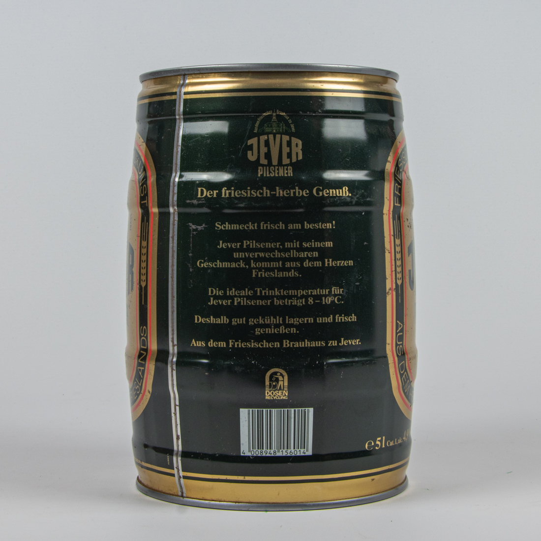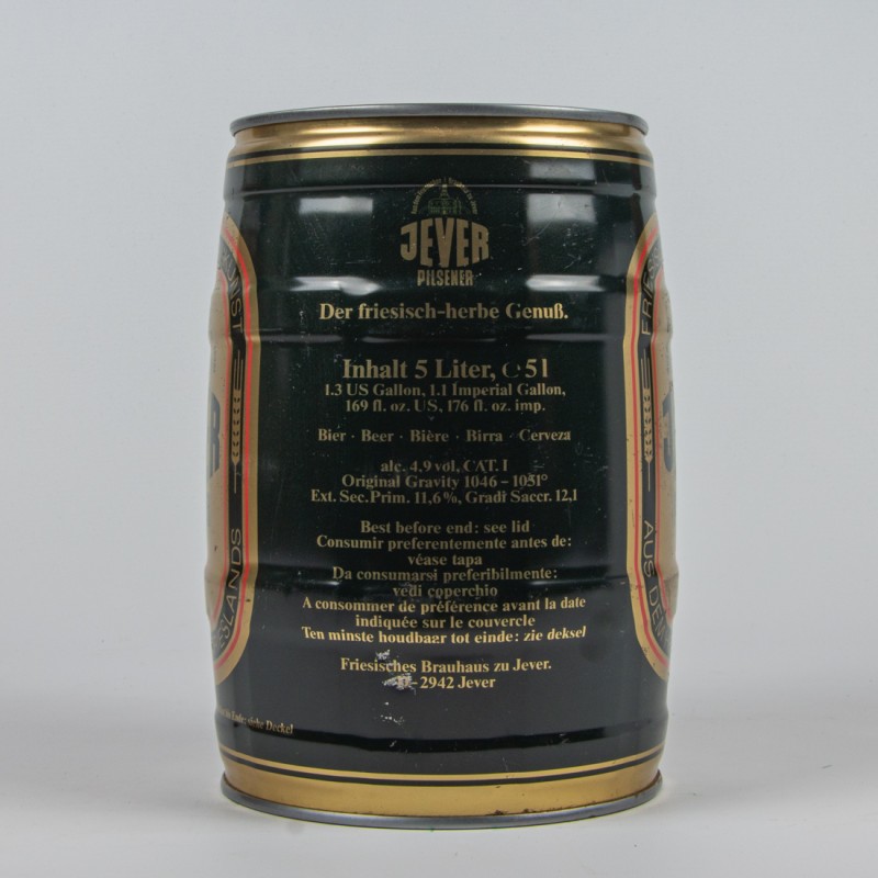 Aus dem Friesischen Brauhaus zu Jever / JEVER / PILSENER / Der friesisch-herbe Genuß. / Schmeckt frisch am besten! / Jever Pilsener, mit seinem unverwechselbaren Geschmack, kommt aus dem Herzen Frieslands. / Die ideale Trinktemperatur für Jever Pilsener beträgt 8-10° C. / Deshalb gut gekühlt lagern und frisch genießen. / Aus dem Friesischen Brauhaus zu Jever. / DOSEN RECYCLING / 4 008948 156014 / Aus dem Friesischen Brauhaus zu Jever / JEVER / PILSENER / Der friesisch-herbe Genuß. / Inhalt 5 Liter / 1,3 US Gallon, 1,1 imperial Gallon. 169 Fl. oz. US 176 fl. oz. imp. / Bier Beer Biere Birra Cerveza / alc. 4,9 vol CAT. I Original Gravity 1046-1051° Ext. sec. Prim. 11,6% Gradi Saccr. 12,1 / Best before end: see lid Consumir preferentemente antes de: vease tapa Da consumarsi preferibilmente: vedi coperchio A consommer de preference avant la date indiquee sur le couvercle Ten minste houdbaar ot einde: zie deksel / Friesisches Brauhaus zu Jever. D-2942 Jever