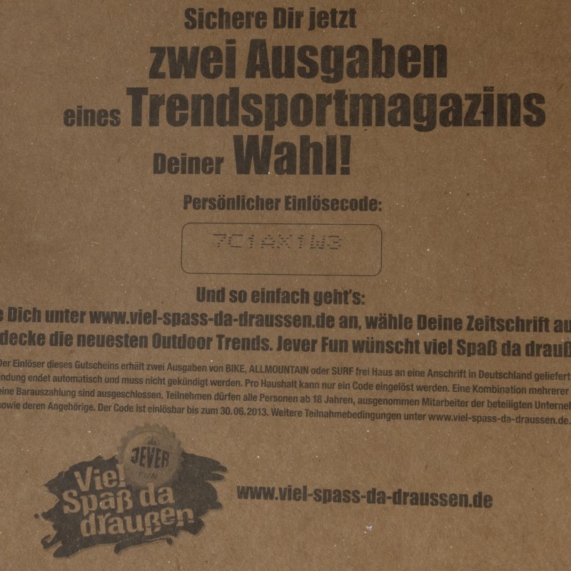 Sichere Dir jetzt zwei Ausgaben eines Trendsportmagazins Deiner Wahl! / Persönlicher Einlösecode: 7C1AX1W3 / Und so einfach geht’s: Melde Dich unter www.viel-spaxx-da-draussen.de an, wähle Deine Zeitschrift aus und entdecke die neuesten Outdoor-Trends. Jever Fun wünscht viel Spaß da draußen. / Der Einlöser dieses Gutscheins erhält zwei Ausgaben von BIKE, ALLMOUNTAIN oder SURF frei Haus an eine Anschrift in Deutschland geliefert. Die Probesendung endet automatisch und muss nicht gekündigt werden. Pro Haushalt kann nur ein Code eingelöst werden. Eine Kombination mehrerer Gutscheine oder eine Baruaszahlung sind ausgeschlossen. Teilnehmen dürfen alle Personen ab 18 Jahren, ausgenommen Mitarbeiter der beteiligten Unternehmen. sowie derem Angehörige. Der Code ist einlösbar bis zum 30.06.2013. Weitere Teilnahmebedingungen unter www.viel-spass-da-draussen.de. / Friesisches Brauhaus / JEVER / FUN / Viel Spaß da draußen / www.viel-spass-da-draussen.de