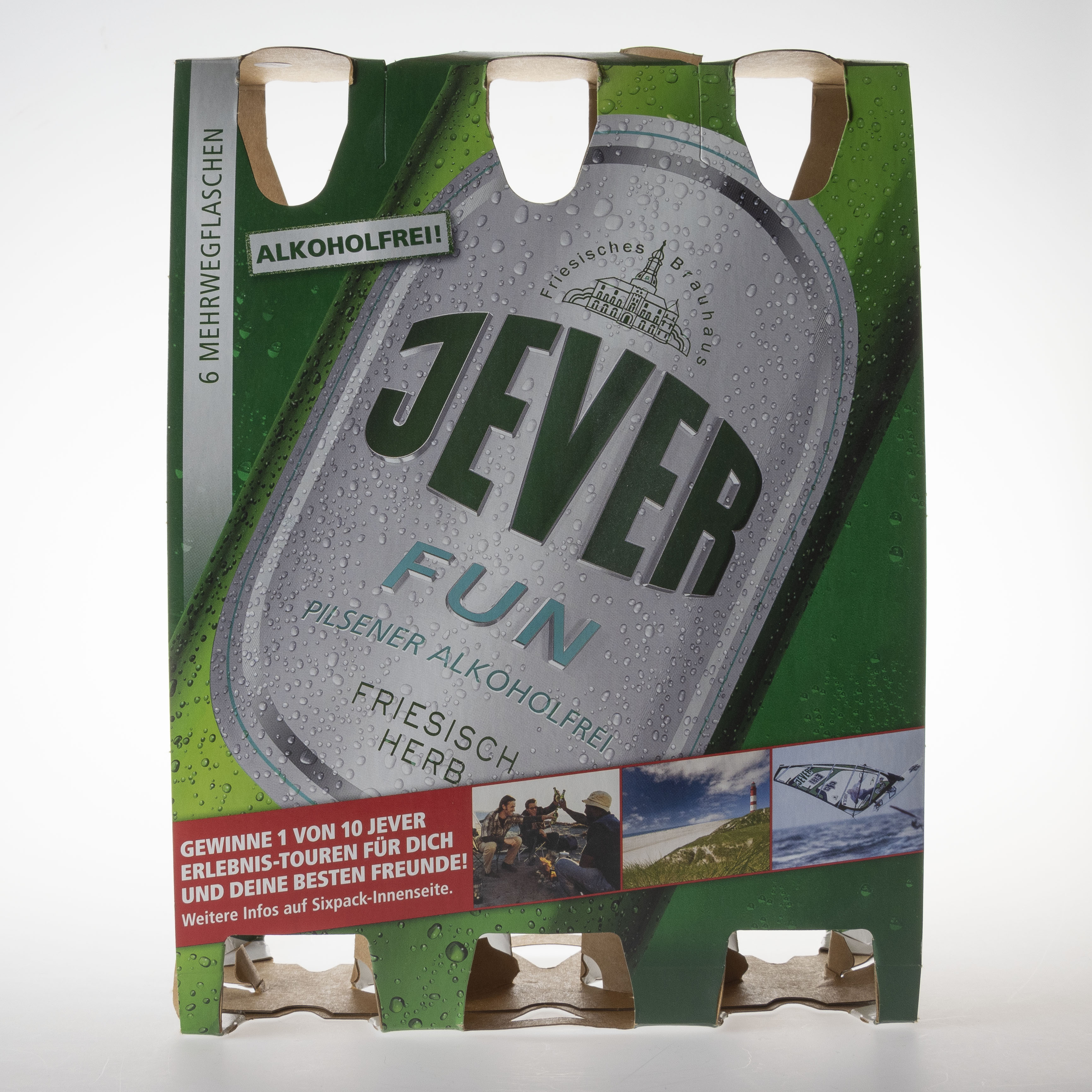 6 MEHRWEGFLASCHEN / ALKOHOLFREI! / Friesisches Brauhaus / JEVER / FUN / PILSENER ALKOHOLFREI / FRIESISCH HERB / GEWINNE 1 VON 10 JEVER ERLEBNIS-TOUREN FÜR DICH UND DEINE BESTEN FREUNDE! Weitere Infos auf Sixpack-Innenseite.