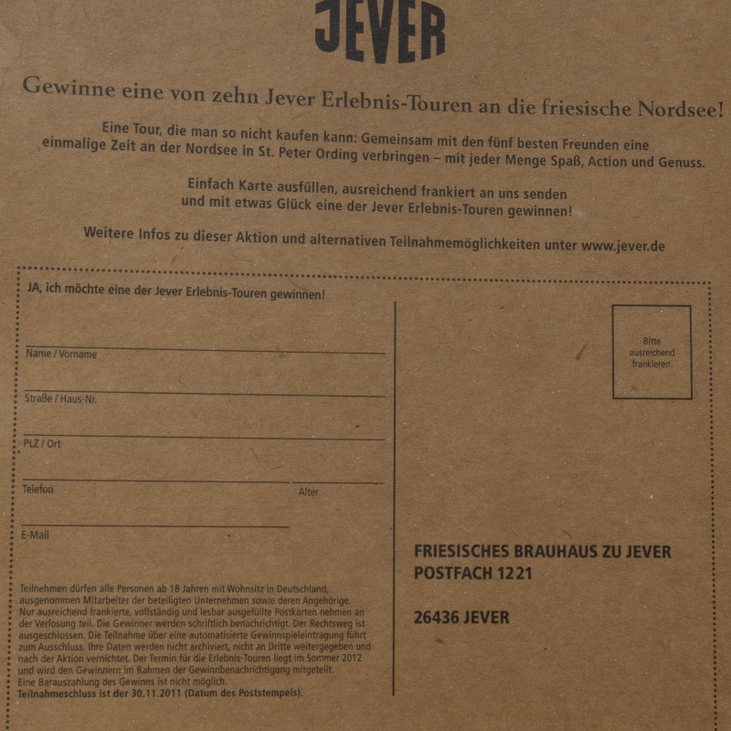 Friesisches Brauhaus / JEVER / Gewinne eine von zehn Jever Erlebnis-Touren an die friesische Nordsee! / Eine Tour, die man so nicht kaufen kann: Gemeinsam mit den fünf besten Freunden eine einmalige Zeit an der Nordsee in St. Peter Ording verbringen - mit jeder Menge Spaß, Action und Genuss. / Einfach Karte ausfüllen, ausreichend frankiert an uns senden und mit etwas Glück eine der Jever Erlebnis-Touren gewinnen! / Weitere Infos zu dieser Aktion und alternativen Teilnahmemöglichkeiten unter www.jever.de / JA, ich möchte einer der Jever Erlebnis-Touren gewinnen! / Name/vorname / Straße/Haus-Nr. / PLZ/Oert / Telefon / Alter / E-Mail / Teilnehmen dürfen alle Personen ab 18 Jahren mit Wohnsitz in Deutschland, ausgenommen Mitarbeiter der beteiligten Unternehmen sowie deren Angehörige. Nur ausreichend frankierte, vollständig und lesbar ausgefüllte Postkarten nehmen an der Verlosung teil. Die Gewinner werden schriftlich benachrichtigt. Der Rechtsweg ist ausgeschlossen. Die Teilnahme über eine automatisierte Gewinnspieleintragung führt zum Ausschluss. Ihre Daten werden nicht archiviert, nicht an Dritte weitergegeben und nach der Aktion vernichtet. Der Termin für die Erlebnis-Touren liegt im Sommer 2012 und wird den Gewinnern im Rahmen der Gewinnbenachrichtigung mitgeteilt. Eine Barauszahlung des Gewinns ist nicht möglich. / Teilnahmeschluss ist der 30.11.2011 (Datum des Poststempels). / Bitte ausreichend frankieren! / FRIESISCHES BRAUHAUS ZU JEVER / POSTFACH 1221 / 26436 JEVER