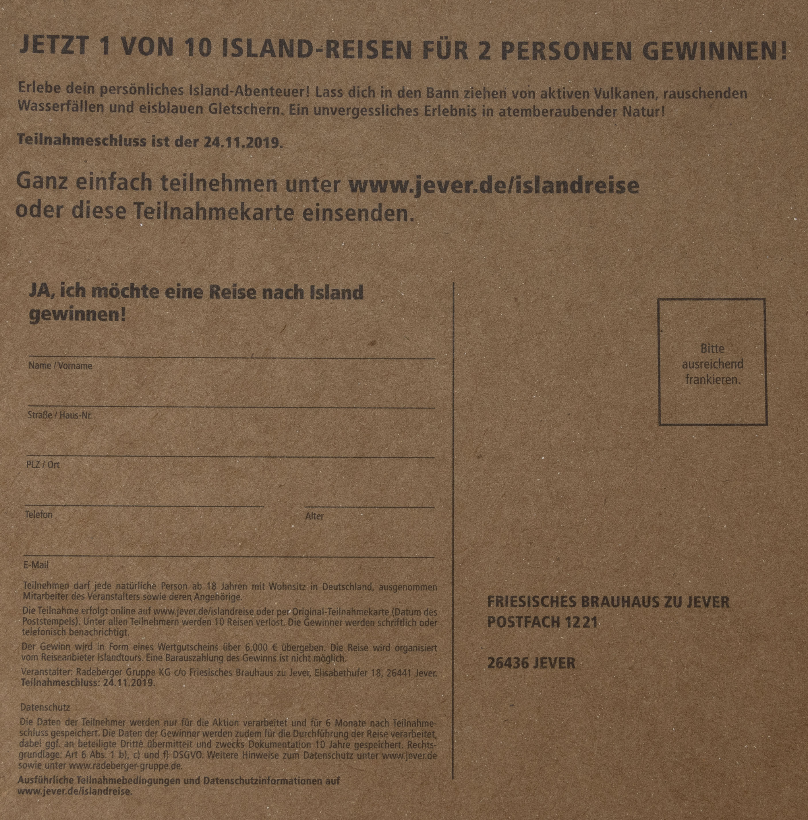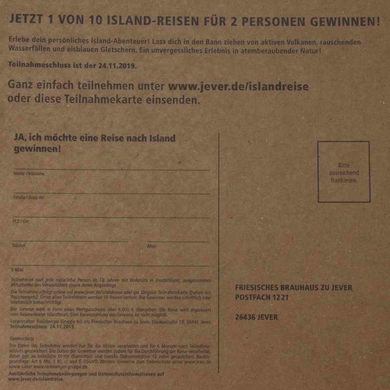 JETZT 1 VON 10 ISLAND-REISEN FÜR 2 PERSONEN GEWINNEN! / Erlebe dein persönliches Island-Abenteuer! Lass dich in den Bann ziehen von aktiven Vulkanen, rauschenden Wasserfällen und eisblauen Gletschern. Ein unvergessliches Erlebnis in atemberaubender Natur! / Teilnahmeschluss ist der 24.11.2019. / Ganz einfach teilnehmen unter www.jever.de/islandreise oder diese Teilnahmekarte einsenden. / JA, ich möchte eine Reise nach Island gewinnen! / Name/Vorname / Straße/Haus-Nr. / PLZ/Ort / Telefon / Alter / E-Mail / Teilnehmen darf jede natürliche Person ab 18 Jahren mit Wohnsitz in Deutschland, ausgenommen Mitarbeiter des Veranstalters sowie deren Angehörige. / Die Teilnahme erfolgt online auf www.jever.de/islandreise oder per Original-Teilnahmekarte (Datum des Poststempels). Unter allen Teilnehmern werden 10 Reisen verlost. Die Gewinner werden schriftlich oder telefonisch benachrichtigt. / Der Gewinn wird in Form eines Wertgutscheins über 6.000€ übergeben. Die Reise wird organisiert vom Reiseanbieter islandtours. Eine Barauszahlung des Gewinns ist nicht möglich. / Veranstalter Radeberger Gruppe KG c/o Friesisches Brauhaus zu Jever, Elisabethufer 18, 26441 Jever. / Teilnahmeschluss: 24.11.2019 / Datenschutz / Die Daten der Teilnehmer werden nur für die Aktion verarbeitet und für 6 Monate nach Teilnahmeschluss gespeichert. Die Daten der Gewinner werden zudem für die Durchführung der Reise verarbeitet, dabei ggf. an beteiligte Dritte übermittelt und zwecks Dokumentation 10 Jahre gespeichert. Rechtsgrundlage: Art. 6 Abs. 1 b) und f) DSGVO. Weitere Hinweise zum Datenschutz unter www.jever.de sowie unter www.radeberger-gruppe.de. / Ausführliche Teilnahmebedingungen und Datenschutzinformationen auf www.jever.de/islandreise. / Bitte ausreichend frankieren. / FRIESISCHES BRAUHAUS ZU JEVER / POSTFACH 1221 / 26436 JEVER