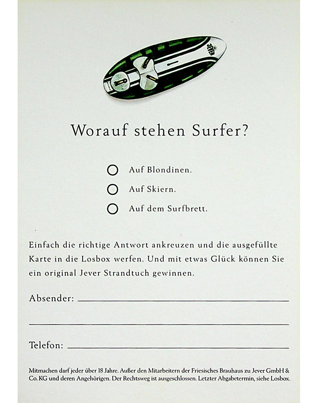 Worauf stehen Surfer? / Auf Blondinen. / Auf Skiern. / Auf dem Surfbrett. / Einfach die richtige Antwort ankreuzen und die ausgefüllte Karte in die Losbox werfen. Und mit etwas Glück können Sie ein original Jever Strandtuch gewinnen. / Absender: / Telefon: / Mitmachen darf jeder über 18 Jahre. Außer den Mitarbeitern der Friesisches Brauhaus zu Jever GmbH & Co. KG und deren Angehörigen. Der Rechtsweg ist ausgeschlossen. Letzter Abgabetermin, siehe Losbox.