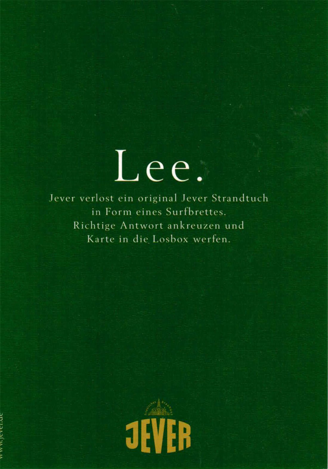 Lee. / Jever verlost ein original Jever Strandtuch in Form eines Surfbrettes. Richtige Antwort ankreuzen und Karte in die Losbox werfen. / www.jever.de / Friesisches Brauhaus / JEVER