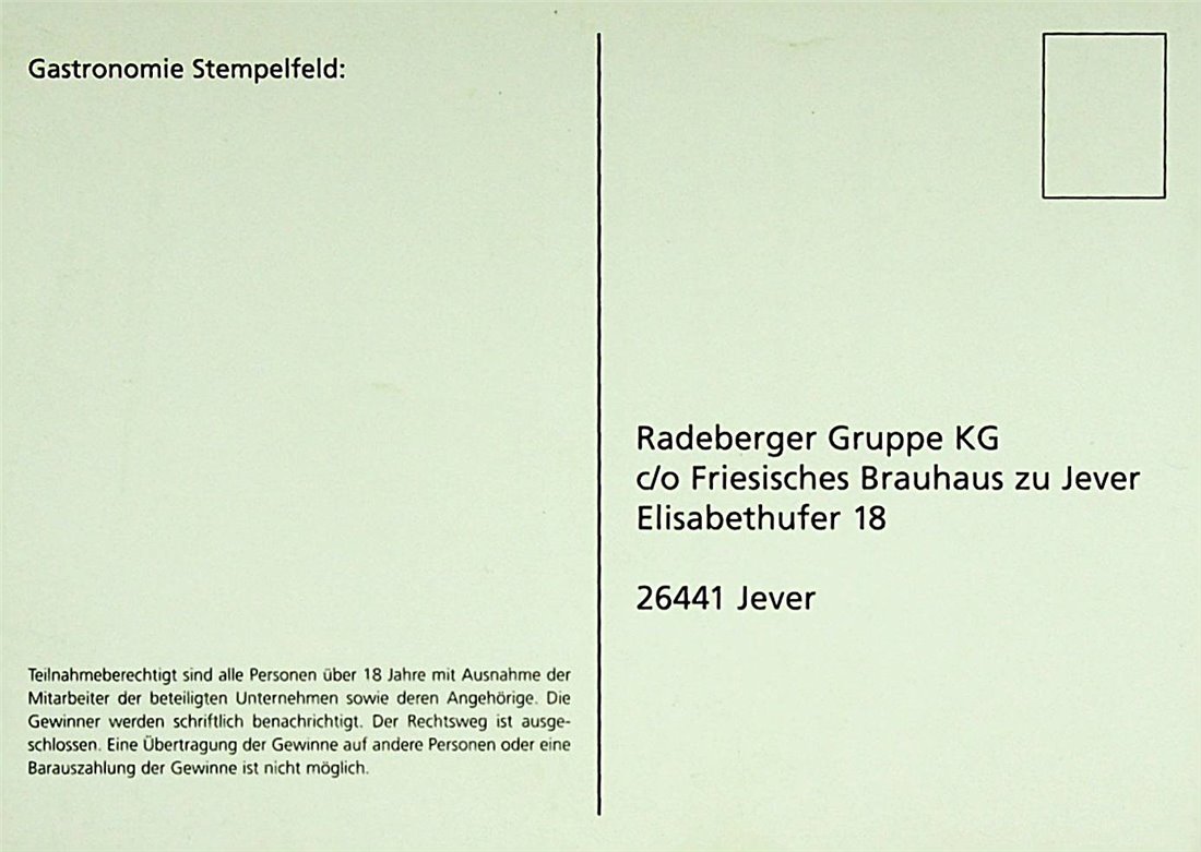 Gastronomie Stempelfeld: / Teilnahmeberechtigt sind alle Personen über 18 Jahre mit Ausnahme der Mitarbeiter der beteiligten Unternehmen sowie deren Angehörige. Die Gewinner werden schriftlich benachrichtigt. Der Rechtsweg ist ausgeschlossen. Eine Übertragung der Gewinne auf andere Personen oder eine Barauszahlung der Gewinne ist nicht möglich. / Radeberger Gruppe KG c/o Friesisches Brauhaus zu Jever Elisabethufer 18 26441 Jever