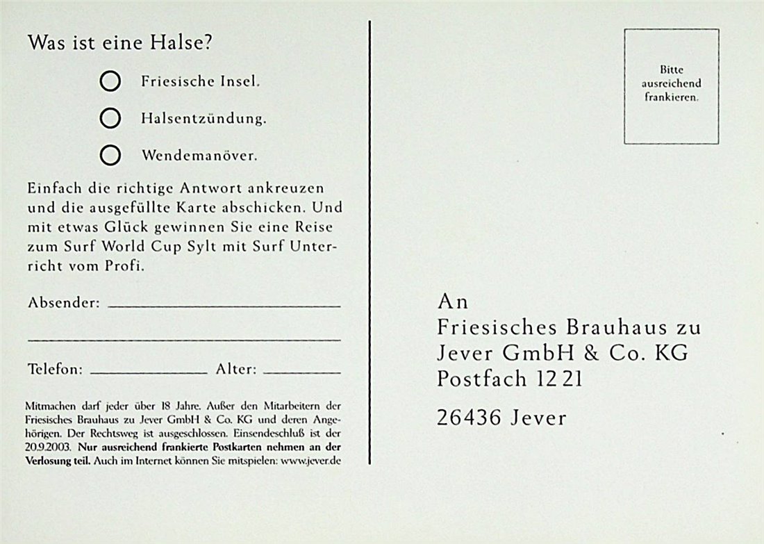 Was ist eine Halse? / Friesische Insel. / Halsentzündung. / Wendemanöver. / Einfach die richtige Antwort ankreuzen und die ausgefüllte Karte abschicken. Und mit etwas Glück gewinnen Sie eine Reise zum Surf World Cup Sylt mit Surf Unterricht vom Profi. / Absender: / Telefon: / Mitmachen darf jeder über 18 Jahre. Außer den Mitarbeitern der Friesisches Brauhaus zu Jever GmbH & Co. KG und deren Angehörigen. Der Rechtsweg ist ausgeschlossen. Einsendeschluss ist der 20.9.2003. Nur ausreichend frankierte Postkarten nehmen an der Verlosung teil. Auch im Internet können Sie mitspielen: www.jever.de / Bitte ausreichend frankieren. / An Friesisches Brauhaus zu Jever GmbH & Co. KG Postfach 1221 26436 Jever