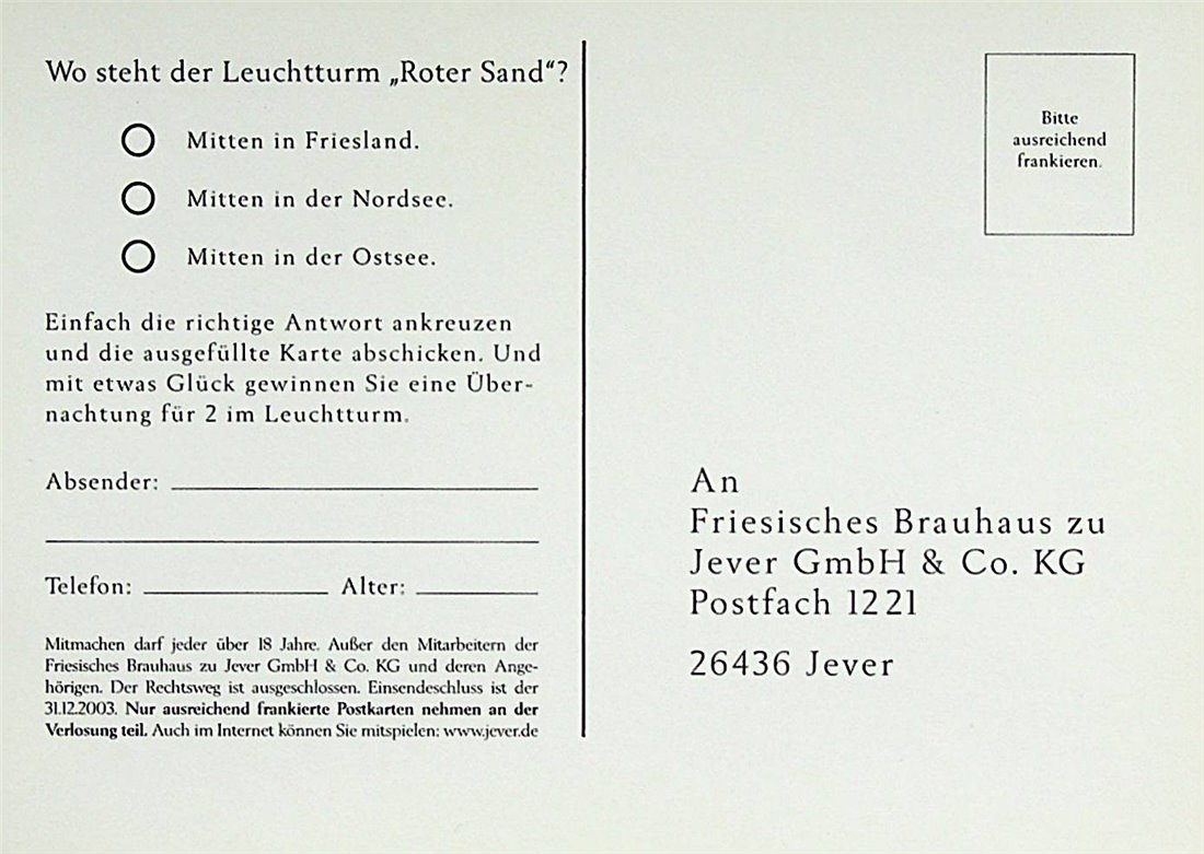 Wo steht der Leuchtturm “Roter Sand”? / Mitten in Friesland. / Mitten in der Nordsee. / Mitten in der Ostsee. / Einfach die richtige Antwort ankreuzen und die ausgefüllte Karte abschicken. Und mit etwas Glück gewinnen Sie eine Übernachtung für 2 im Leuchtturm. / Absender: / Telefon: / Mitmachen darf jeder über 18 Jahre. Außer den Mitarbeitern der Friesisches Brauhaus zu Jever GmbH & Co. KG und deren Angehörigen. Der Rechtsweg ist ausgeschlossen. Einsendeschluss ist der 31.12.2003. Nur ausreichend frankierte Postkarten nehmen an der Verlosung teil. Auch im Internet können Sie mitspielen: www.jever.de / Bitte ausreichend frankieren. / An Friesisches Brauhaus zu Jever GmbH & Co. KG Postfach 1221 26436 Jever