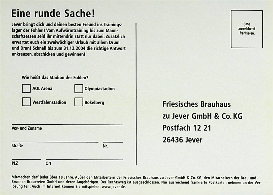 Eine runde Sache! / Jever bringt dich und deinen besten Freund ins Trainingslager der Fohlen! Vom Aufwärmtraining bis zum Mannschaftsessen seid ihr mittendrin statt nur dabei. Zusätzlich erwartet euch ein zweiwöchiger Urlaub mit allem Drum und Dran! Schnell bis zum 31.12.2004 die richtige Antwort ankreuzen, abschicken und gewinnen! / Wie heißt das Stadion der Fohlen? / AOL Arena / Olympiastadion / Westfalenstadion / Bökelberg / Vor- und Zuname / Straße / Nr. / PLZ / Ort / Mitmachen darf jeder über 18 Jahre. Außer den Mitarbeitern der Friesisches Brauhaus zu Jever GmbH & Co. KG, den Mitarbeitern der Brau und Brunnen Brauereien GmbH und deren Angehörigen. Der Rechtsweg ist ausgeschlossen. Nur ausreichend frankierte Postkarten nehmen an der Verlosung teil. Auch im Internet können Sie mitspielen: www.jever.de / Bitte ausreichend frankieren. / An Friesisches Brauhaus zu Jever GmbH & Co. KG Postfach 1221 26436 Jever